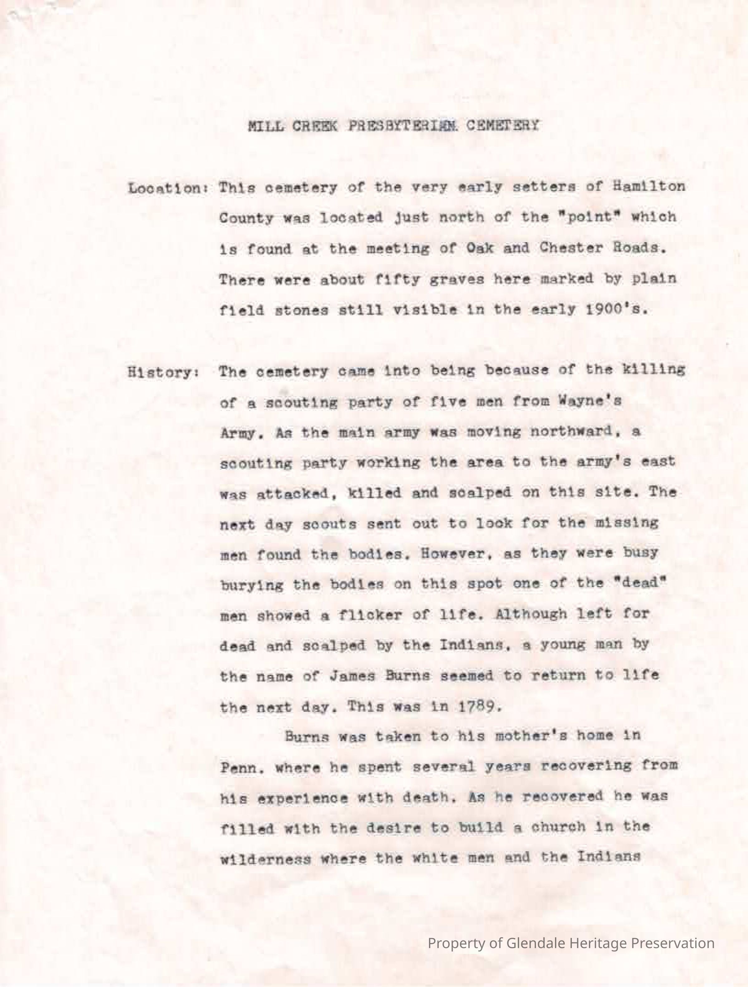 The cemetery was located just north of the point at the meeting of Oak and Chester Roads, There were about 50 graves marked by plain field stones in the early 1900s. The cemetery came into being because of the killing of a scouting party of five men from Wayne's army. This area is known as Tucker's Station.