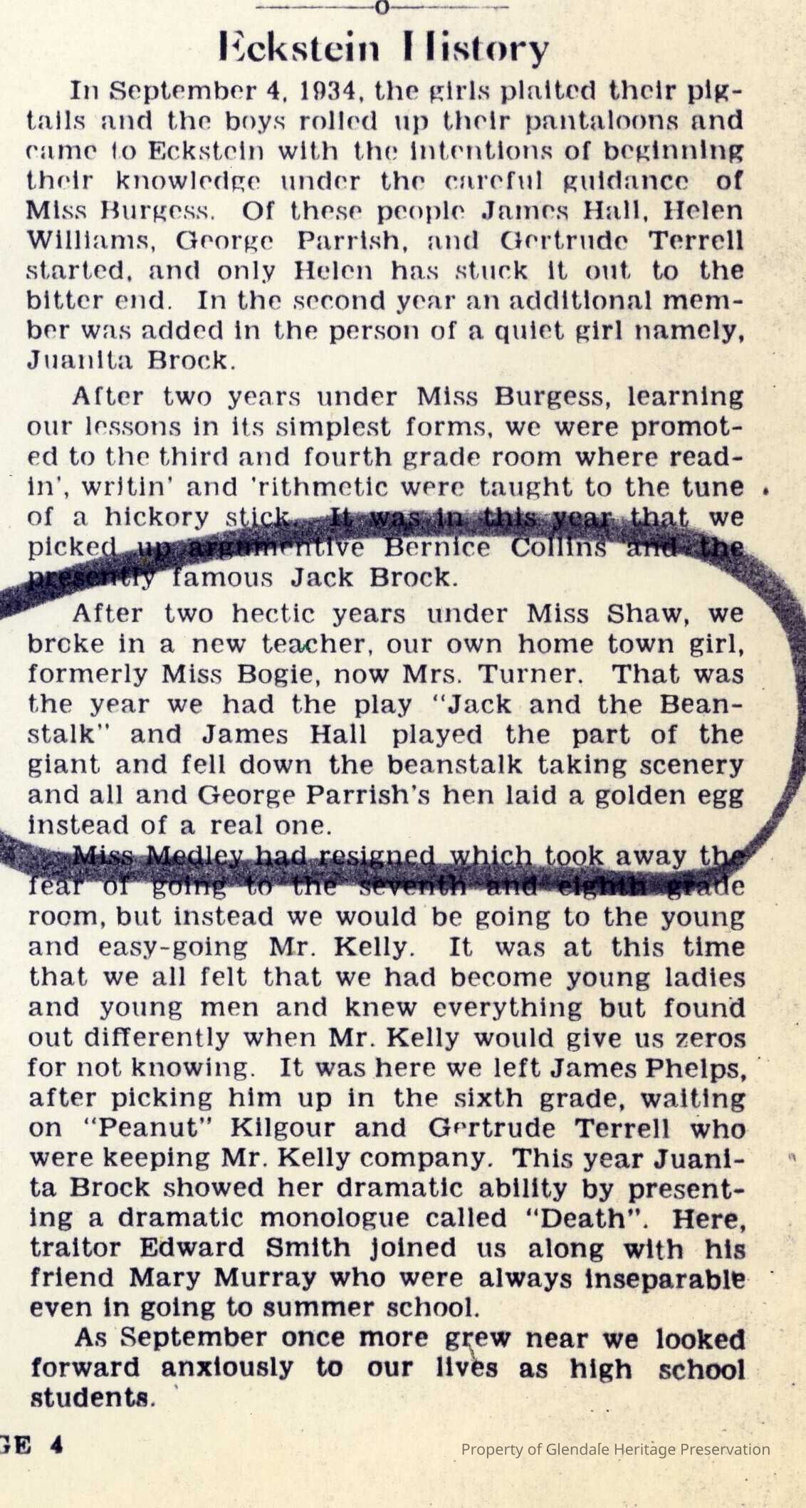 Eckstein Newsletter excerpt written by students in 1934