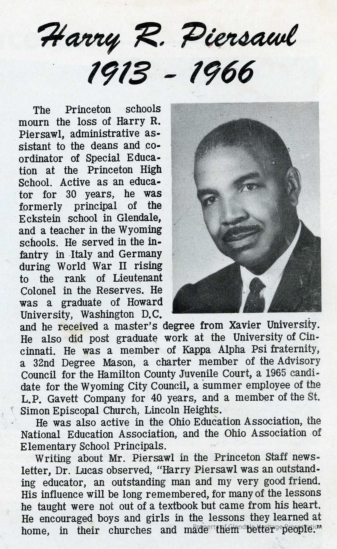 Newspaper Article - Obituary for Harry R. Piersawl, Principal and Teacher at the Eckstein SchoolLexicon