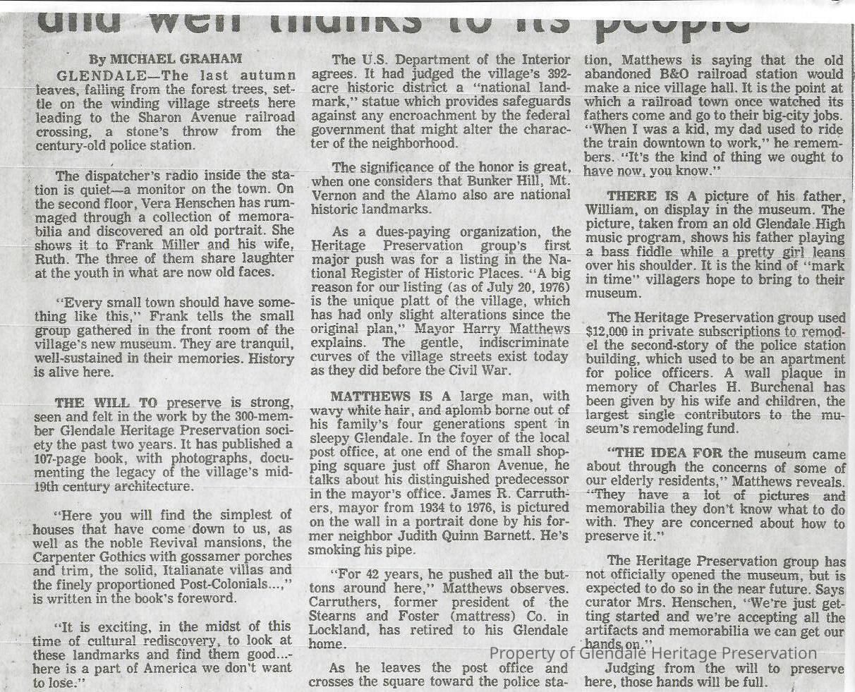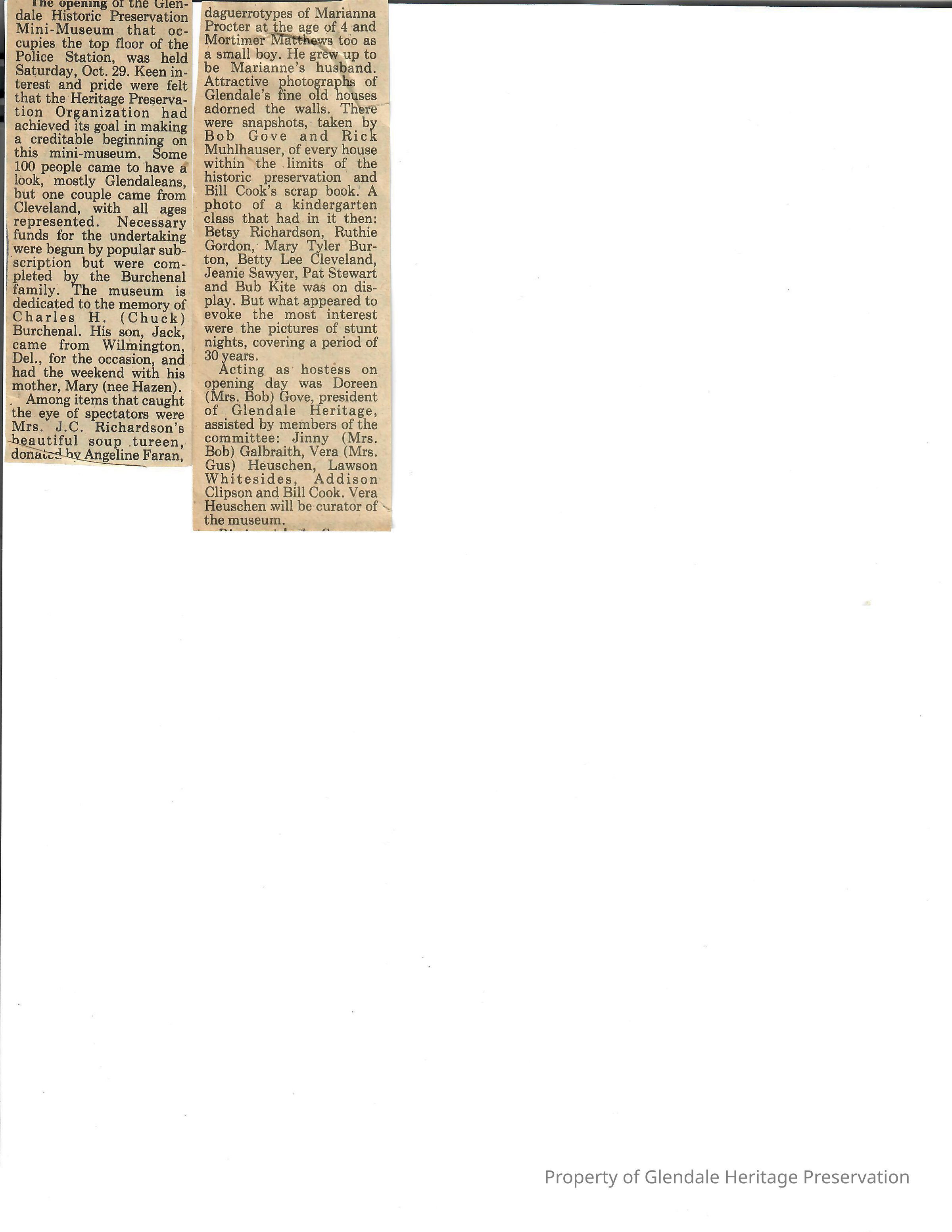Two newspaper clippings about the Glendale Historic Preservation Mini-Museum Opening. Located on the top floor of the Police Station. Dedicated to the memory of Charles H. (Chuck) Burchenal. This was the first museum in Glendale.