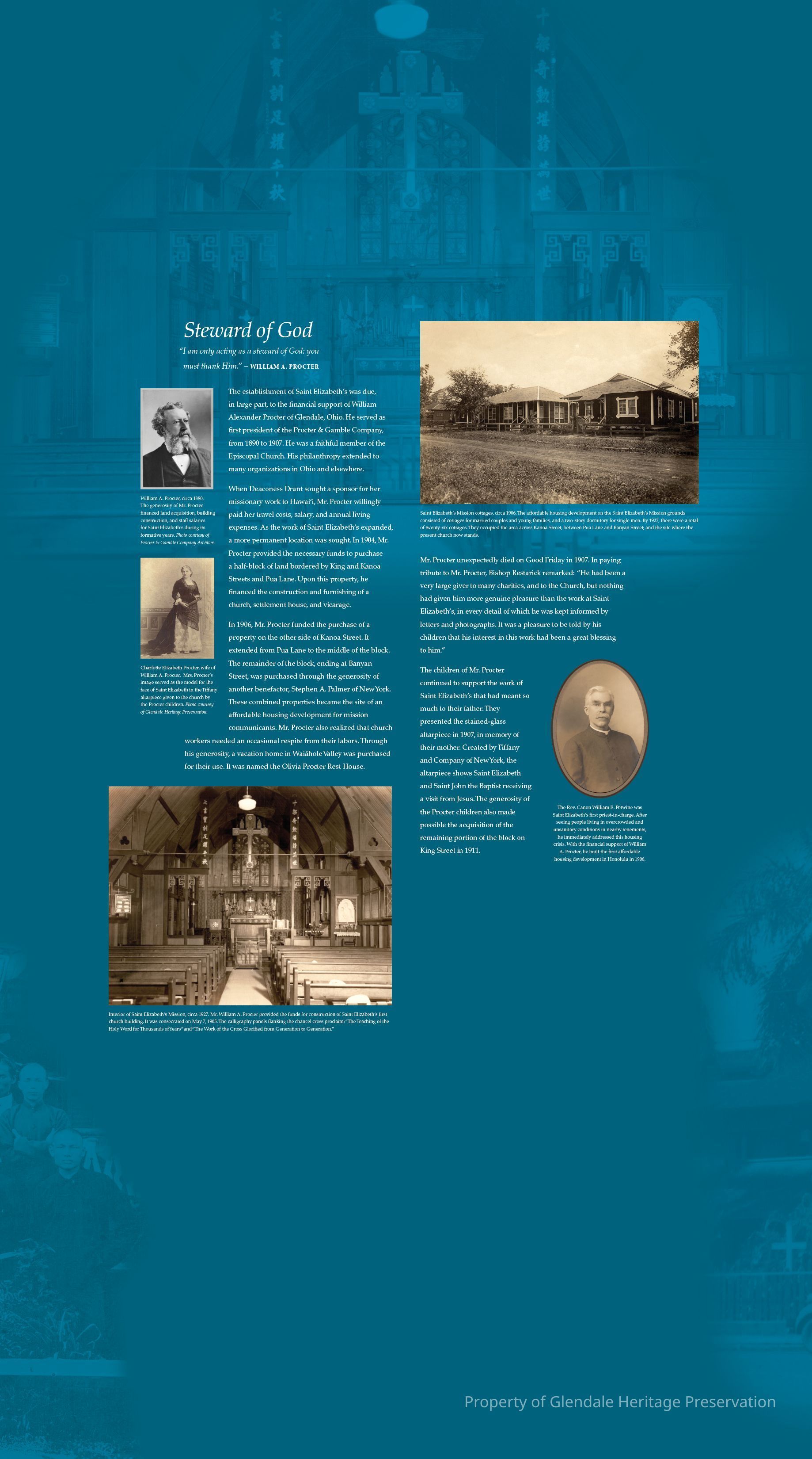 Collection of Panels used in exhibit presented by St. Elizabeth Episcopal Church in Honolulu. Digital copies of some of the panels were sent to GHP with permission to use in an exhibit. The panels we received are ones which mention the contributions of the Procter family.Create Date