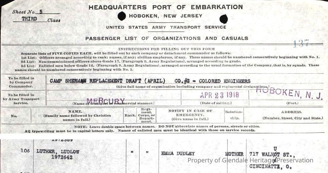 Private Ludlow Luther - Collection of photographs and documents of his service and death in France during World War I. He is buried in Beech Grove Cemetery, Wyoming, OH. He is one of two Glendale soldiers who did not survive the War.Lexicon