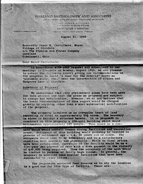 Report from Harland Bartholomew And Associates, August 21, 1962. The property involved would be called Glendale Manor and would be located at the intersection of and Hedgerow Avenues. The proposal was presented to Mayour Jim Carruthers. It was not acted upon.Create Date