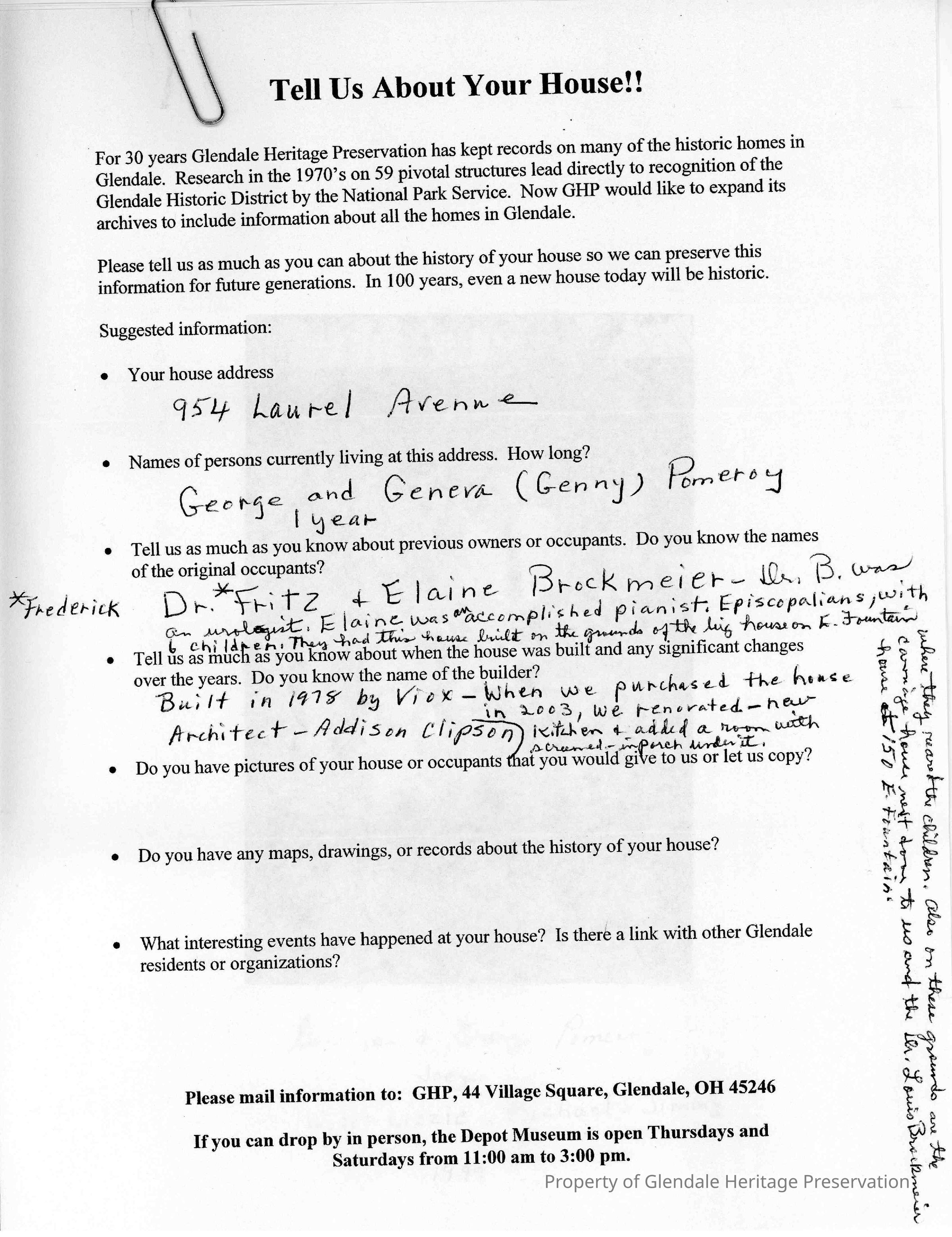 The architect was Addison Clipson, builder was (John?) Viox. It ws built on the grounds of the "big" house on East Fountain by Dr. and Mrs. Brockmeier.