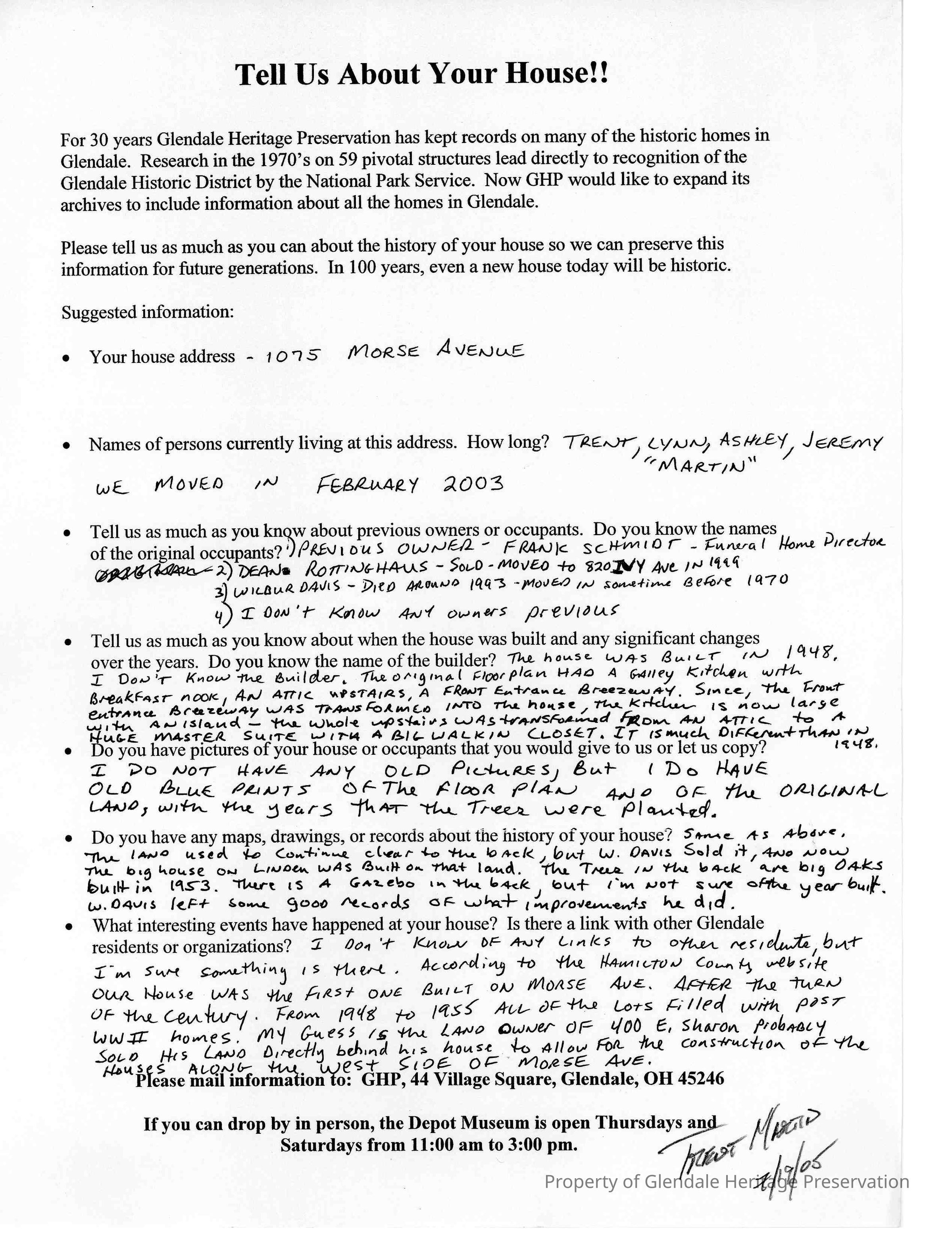 This House, located at 1075 Morse Avenue, was built in 1948. Over the years extensive renovations have been done. According to the Hamilton county Recorder's office, this house was the first one built on Morse Avenue after the turn of the century.