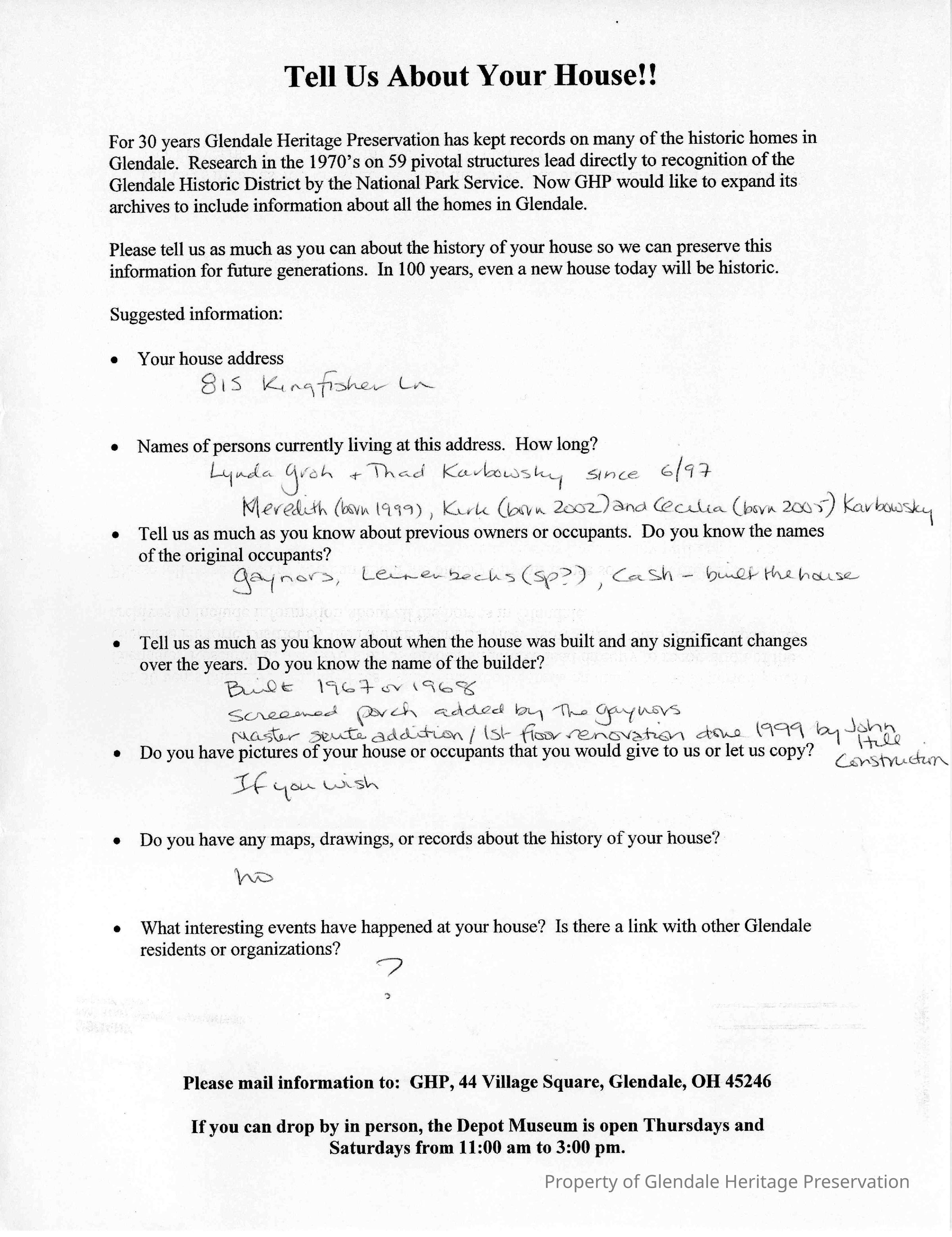 This house, located at 815 Kingfisher Lane, was built circa 1967 by the Cash family. A screened porch has since been added as well as first floor renovations in 1999.Lexicon