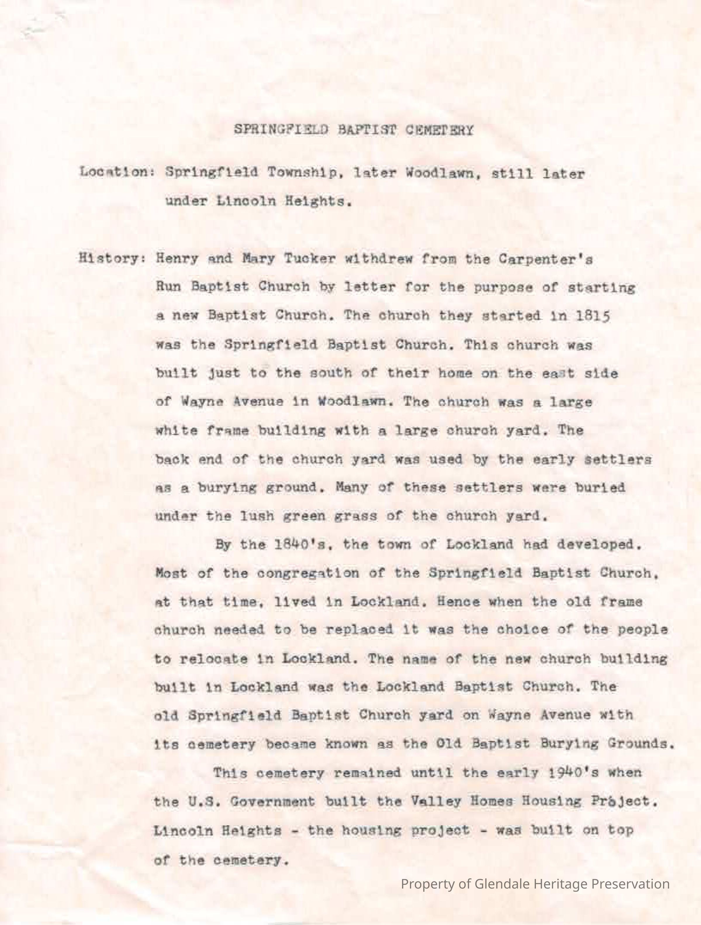 Set of documents by Bill James Cook regarding the Springfield Baptist Cemetery . The cemetery was established in the early 1800s. It was originally located in Springfield Township, later Woodlawn, later still Lincoln Heights.