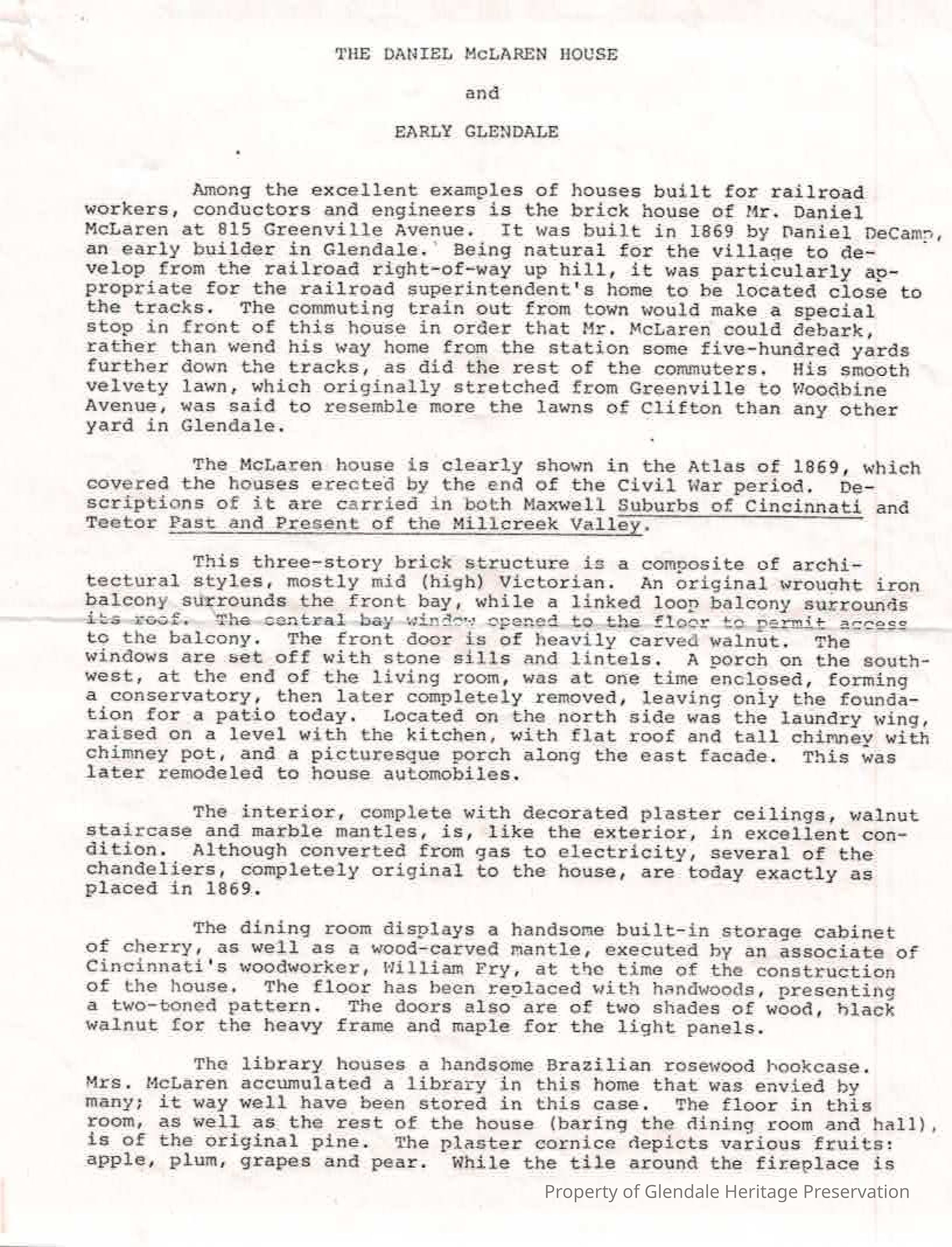 4 page article about the Daniel McLaren House. Details about other houses, village maintenance, lamp lights and social customs in Glendale also included in the article. Full text of document attached to this record.