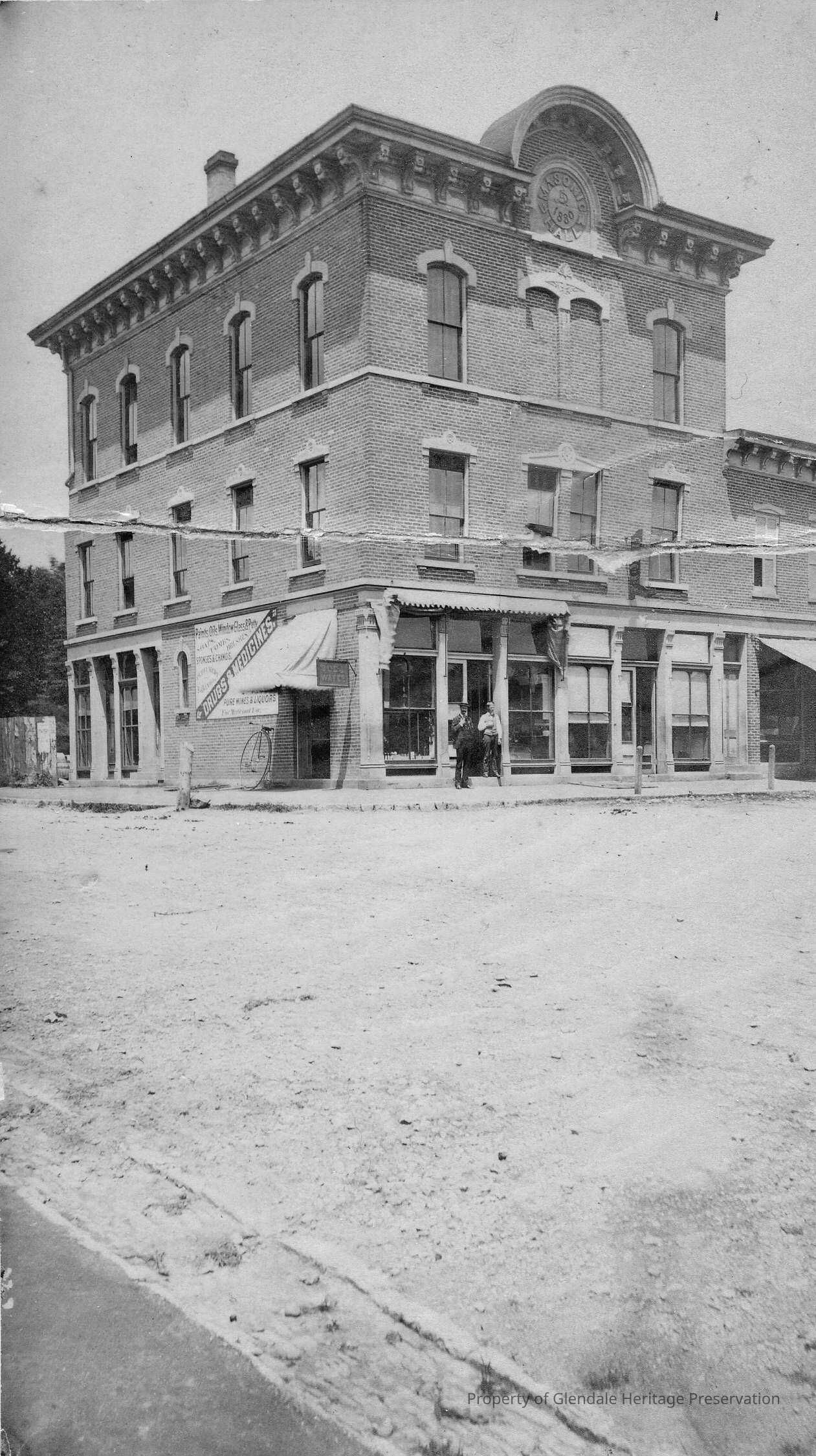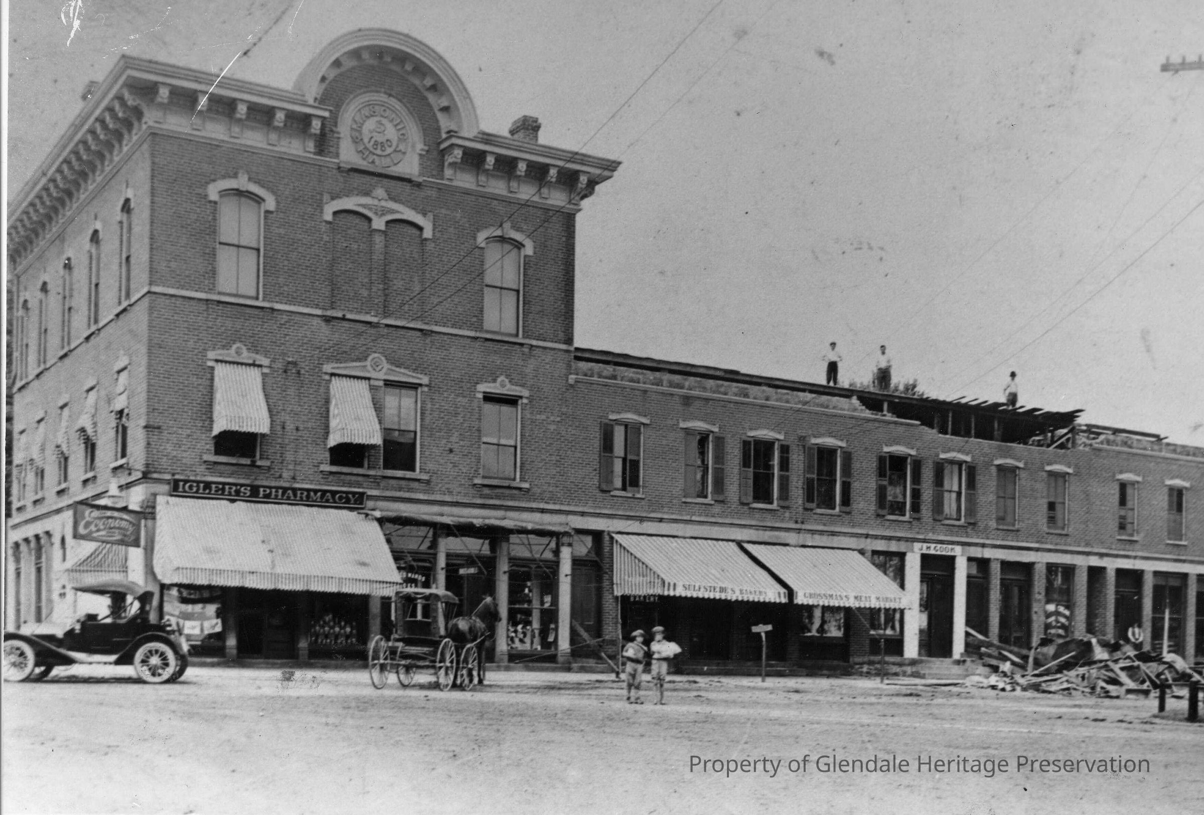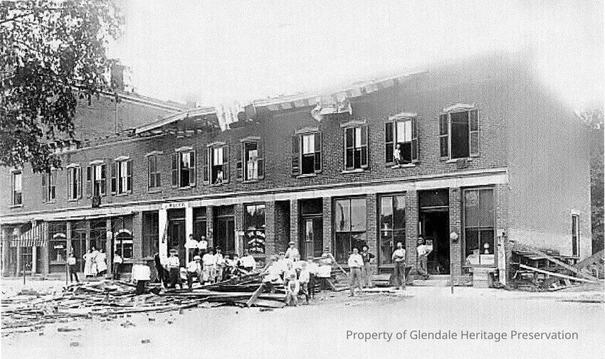 Italianate, Masonic Order, Fire of 1880, 21 Village Square, Pivotal Structure, Glendale Yarn Shop, Tornado of 1912, Igler's Pharmacy, Shoot the Moon Photography, Blue Bird Bakery, Grossman's Meat Markert, Selfstedes Bakery, J. H. Gook's White Cloud Laundry, Businesses