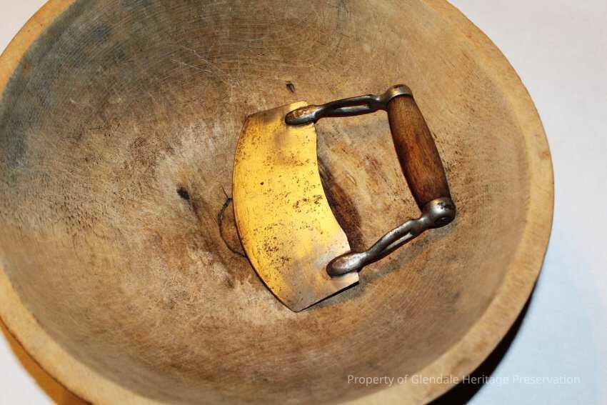 Wood Chopping Bowl used by Mrs. John Riddle (1788-1873) in the kitchens of the Lion House now known as the Pillars. Metal and wood chopping tool included with the bowl.Lexicon