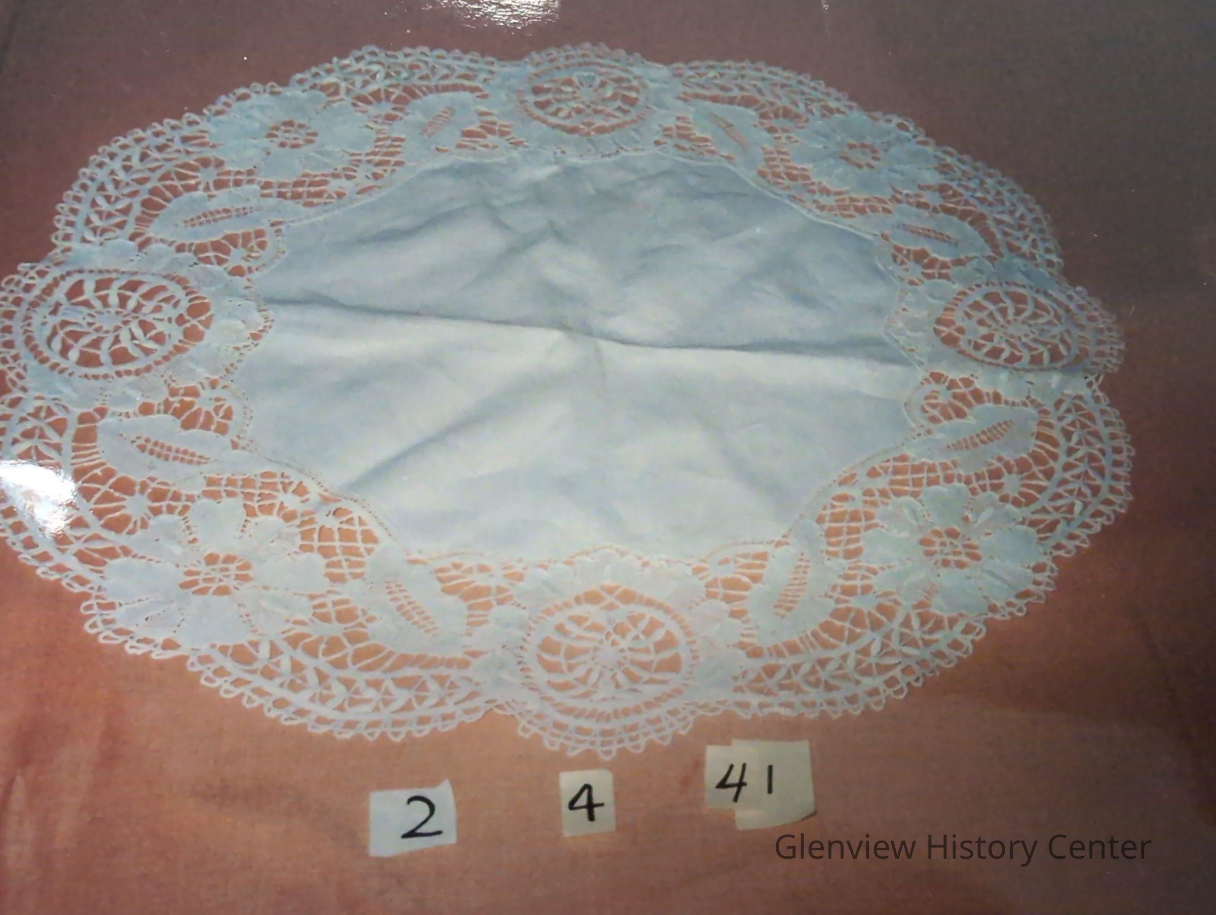 large white linen doily with crochet edging lacy white linen 24 1/2 " diameter crochet edging 5" in width linen d center is 14 1/2"