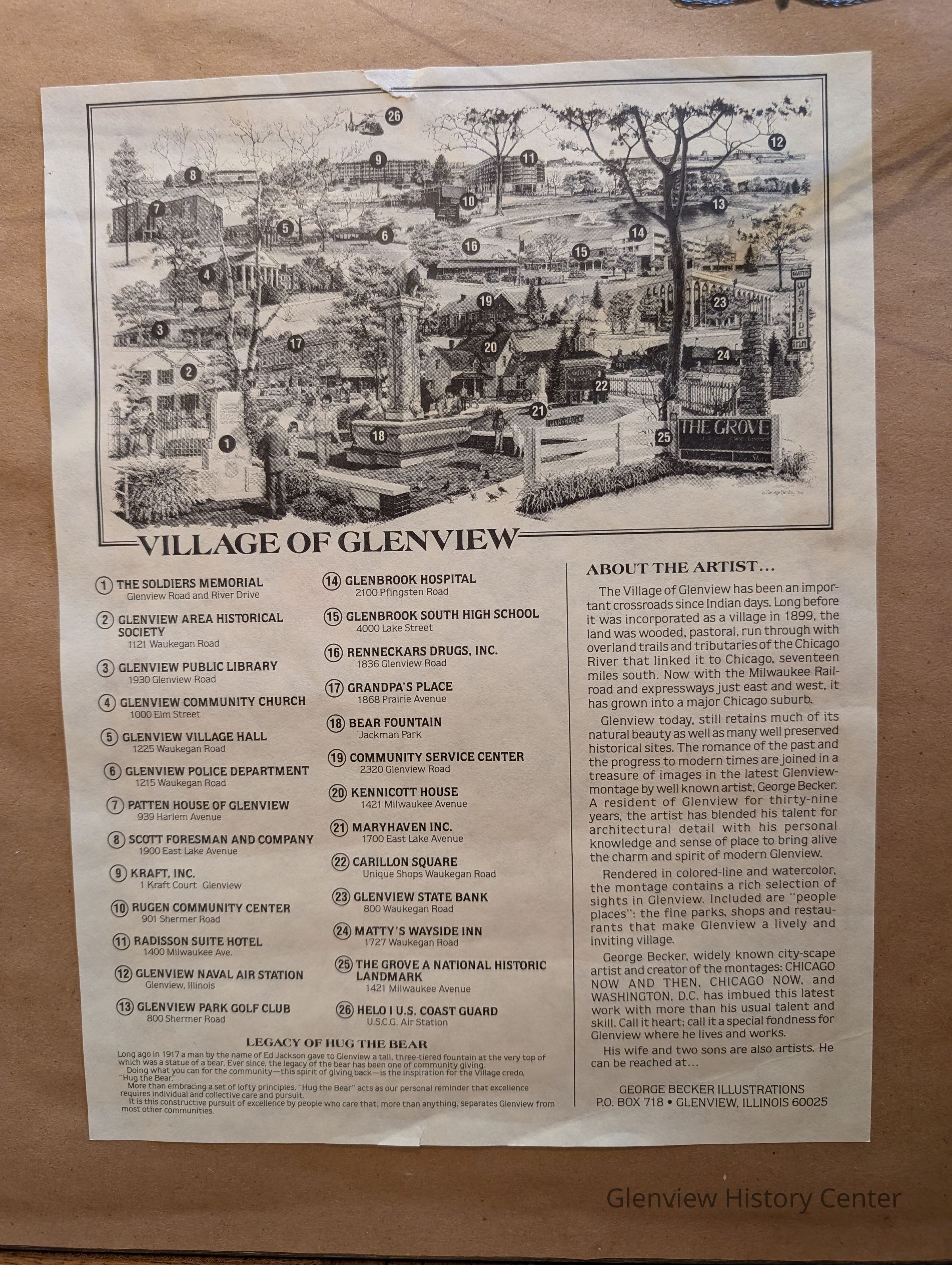 George Becker lived in Glenview from 1955 until his death in 1996. He was a well-known illustrator and he depicted himself in this montage facing the Veteran's Memorial.