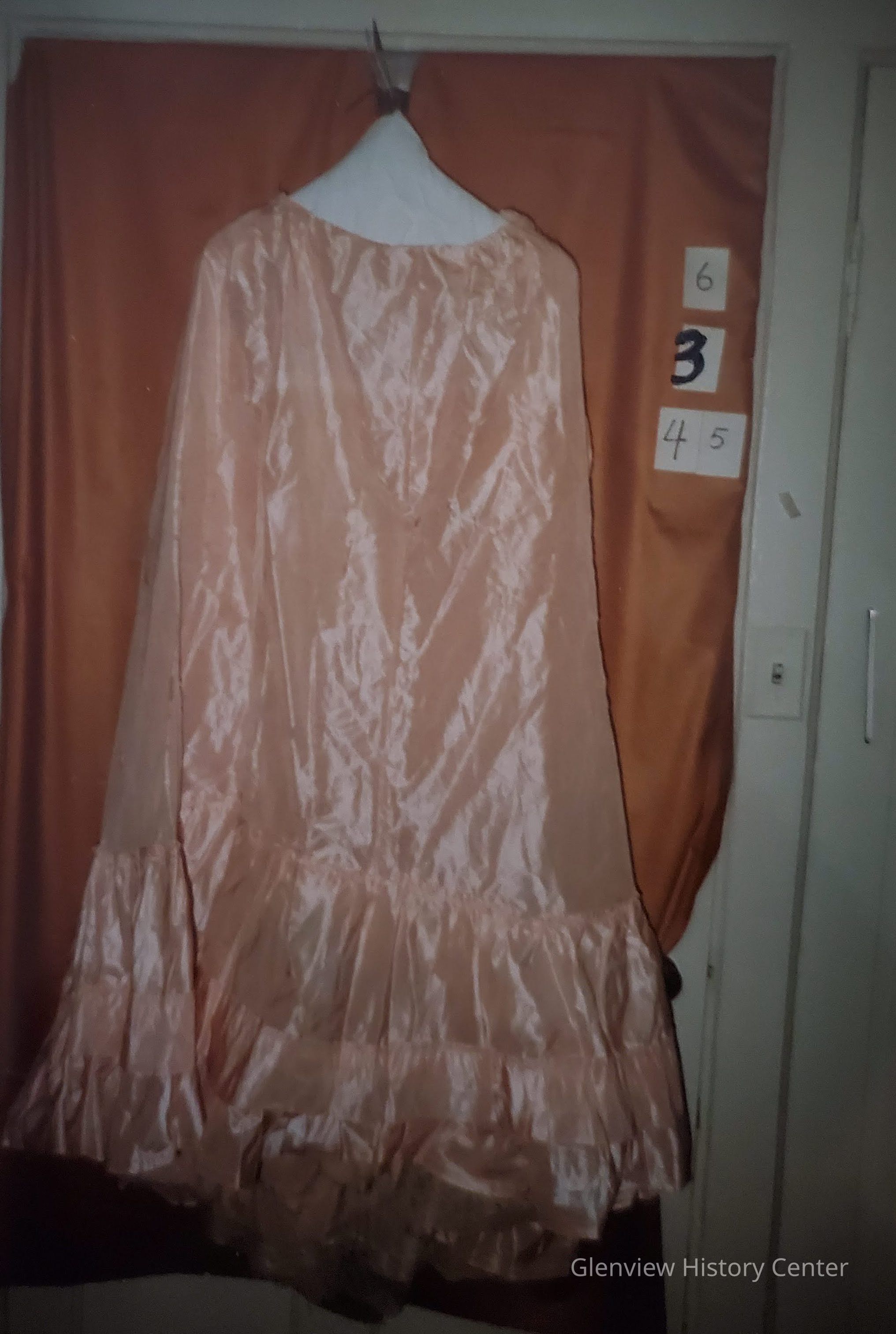 Lady's pink silk crepe skirt is 45" long attached to inner skirt of pink silk taffeta petticoat. Between the two skirts is white flounce with 3" wide lace on bottom. Total length of flounce is 19". The bottom 18" of taffeta underskirt is ruffle, 1/2" of this ruffle extends above this ruffle. 3" ruffle is attached to the taffeta skirt 7" above bottom. Waistband measures 25". Fasteners are hooks and eyes. Taffeta shredding due to finish of metallic salts (weighting) to silk fabric when manufactured. Brown stains.