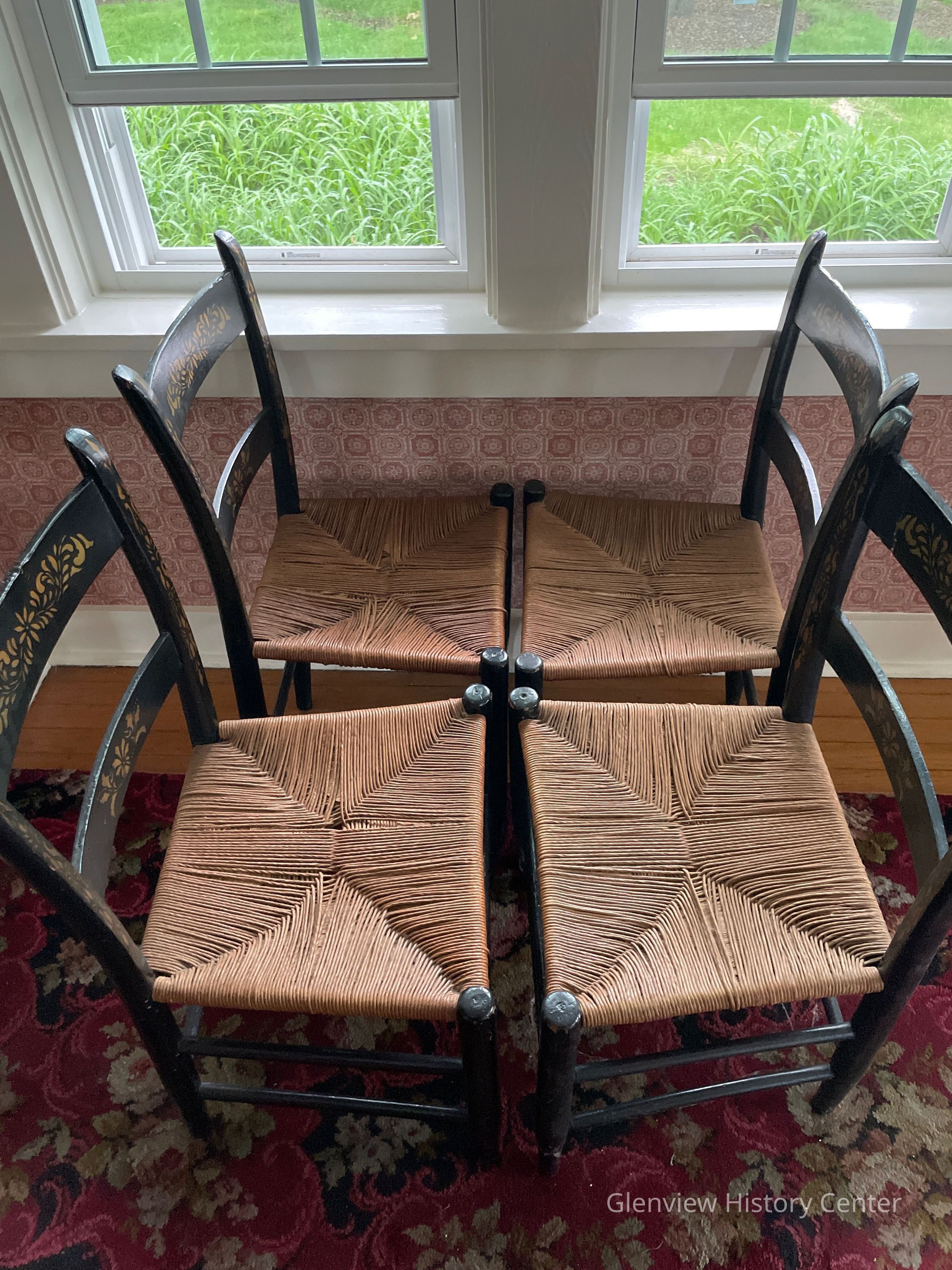 Set of four Hitchcock black chairs with gold leaf scroll patterns and rush seats