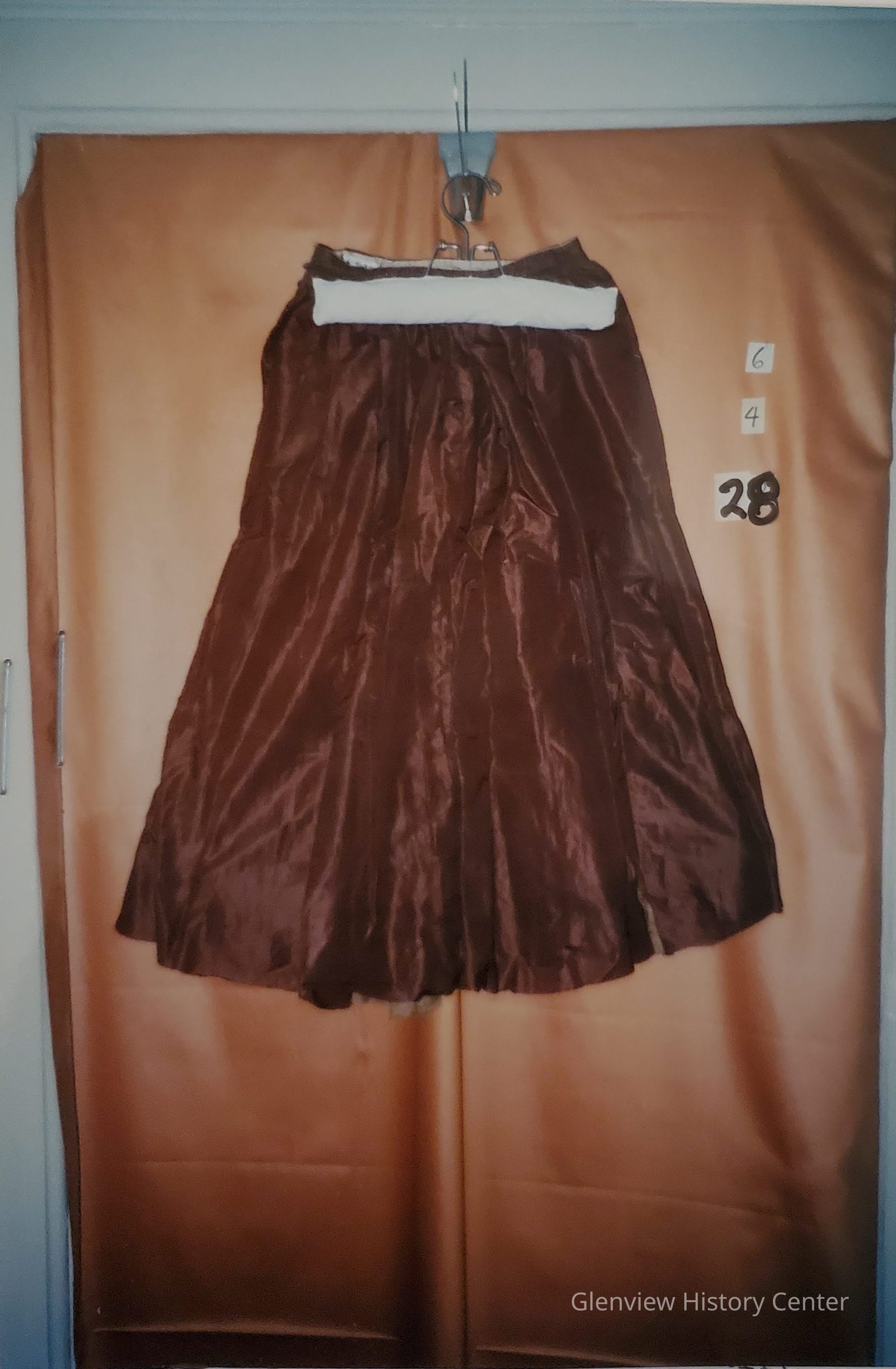 Brown silk taffeta 3/4" waistband and length of 24". Side placket opening with large black hook and is 7-3/4" in length. Extension of the self fabric 1" in width and 2 metal hooks and eyes -- 7 gored skirt. Length from waistband 28-1/2". Hem has been cut and it is unfinished. Construction in side is one piece with lining and silk taffeta combination.Acquisition