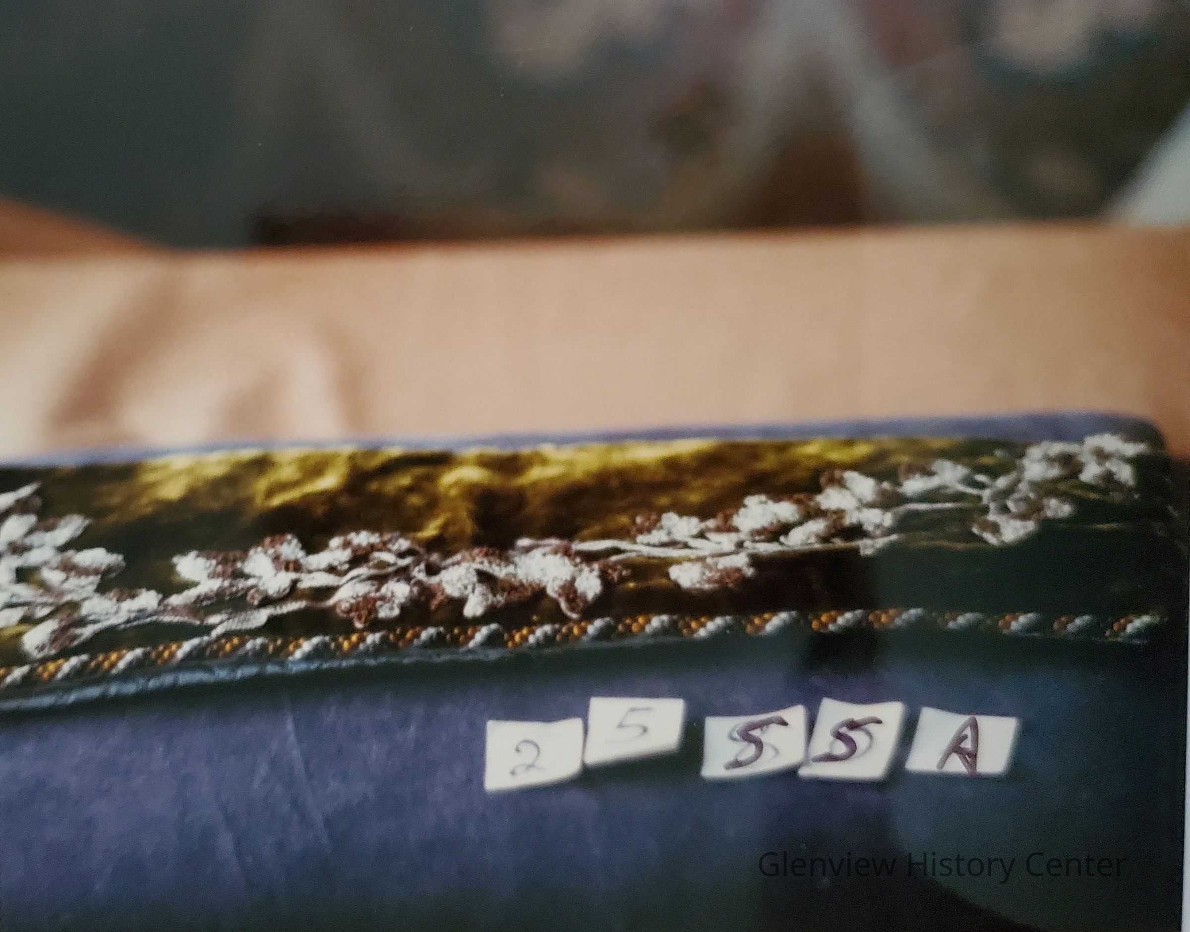 C) 17-1/2" X 4 pocket for tan velvet and yellow silk lining with printed flowers and initials U.Y.