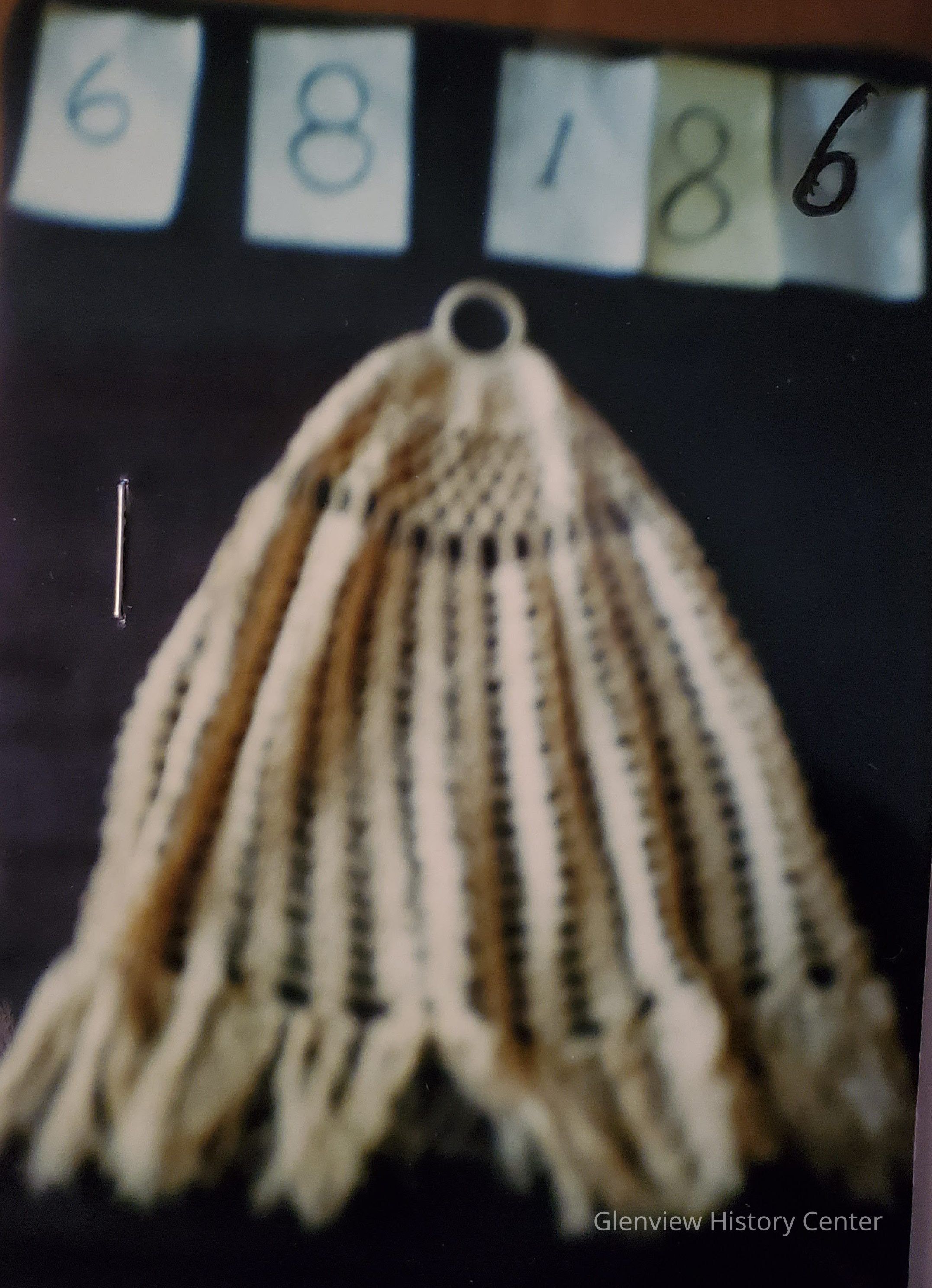 Ecru crochet  jabot - 10-1/2" long - fringe at bottom - 2-1/2" long. Metal ring at top covered with crocheted stitching.Acquisition