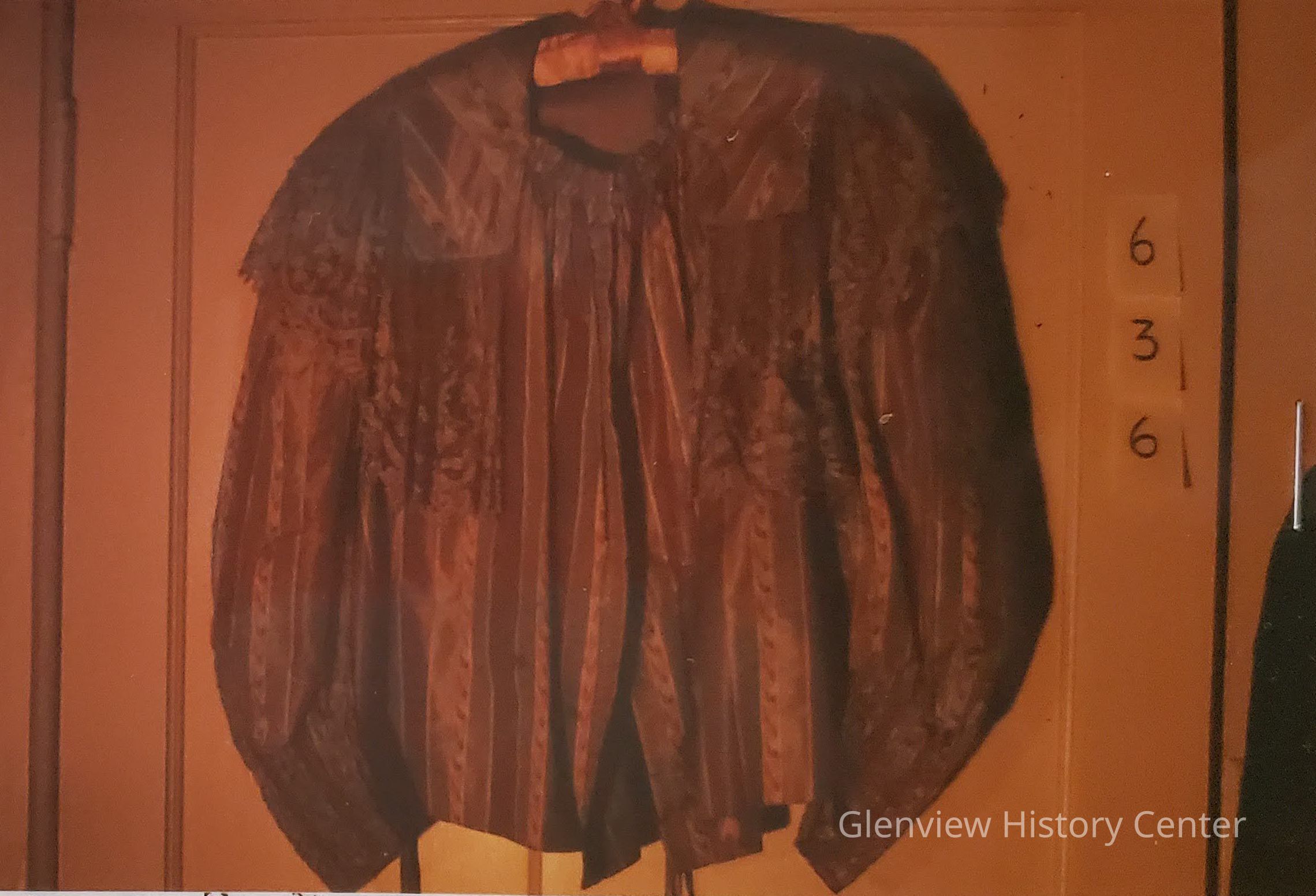 Printed striped silk taffeta bodice top; color fawn beige, silvery-white, tiny pencil thin grey stripes and shocking pink, rose pink, and fern green moire waterprint stripe; Style: large flat collar 3-1/4" front section. 4" width at shoulder line; collar shape is extended rectangular flap with 8" embroidered ecru lace attached by machine to edge of collar; Long sleeve, puff cap; bottom of sleeve is 4" of 9 rows of shirring sleeve edge is rolled over the top stitched; sleeve close is hook and eyes (4) on underseam. Center front opening, 6 hook and eye close. Self hem 1-1/2" hand stitch (blind stitch); 3" tight gathered top collar line between collar and center front opening on both sides of blouse. Underneath construction: 3/8" striped tape to hold double gathers on front neckline. Inside 1" waist cincher self fabric attaches at center back two hooks to connect skirt with bodice top; looks like a tie front? 4" of shirring in 3 rows of running stitch gather located at center back (2" on either side CB Lace is machine made embroidered with stem of flowers and chains outline scallop edge; Sailor back collar; fully lined with thin beige cotton right back of collar.Acquisition