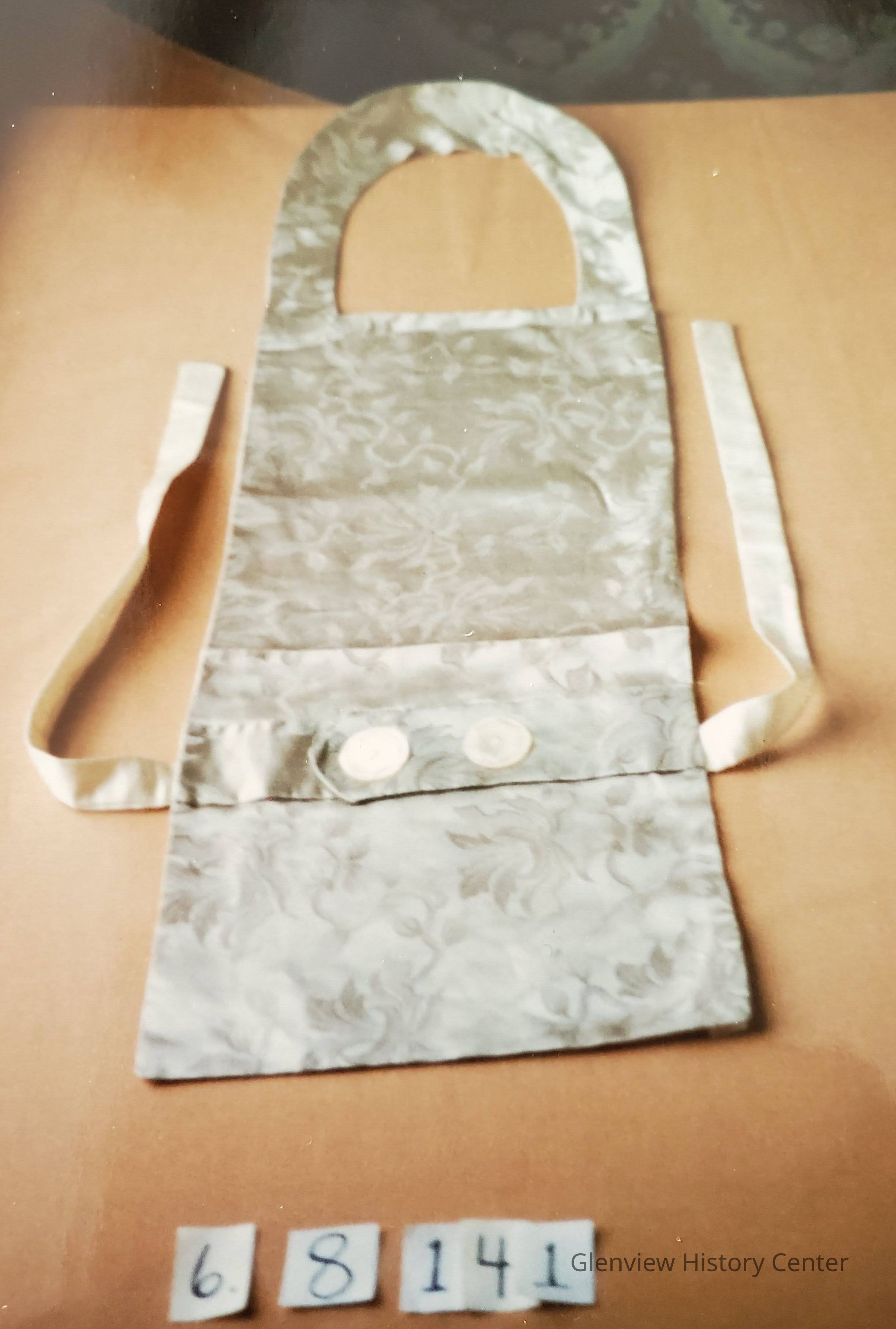 Bib top with 4 snaps to hold vest around neck. 12" from top edge is a self fabric tab 2" wide, 2 pearl button, 1" diameter decorate the tab, 1" lighter beige satin tie 14" long - ties at center back.General Notes