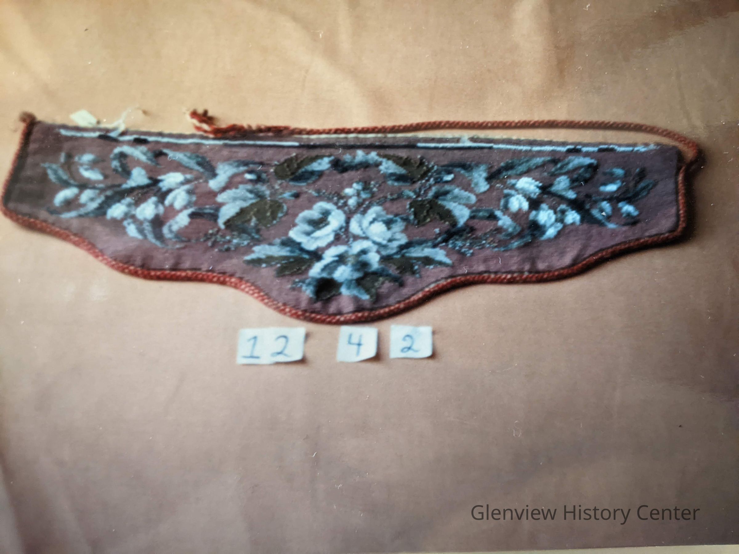 Pieces of needlepoint antimacassar in brown. Beaded with flower design.