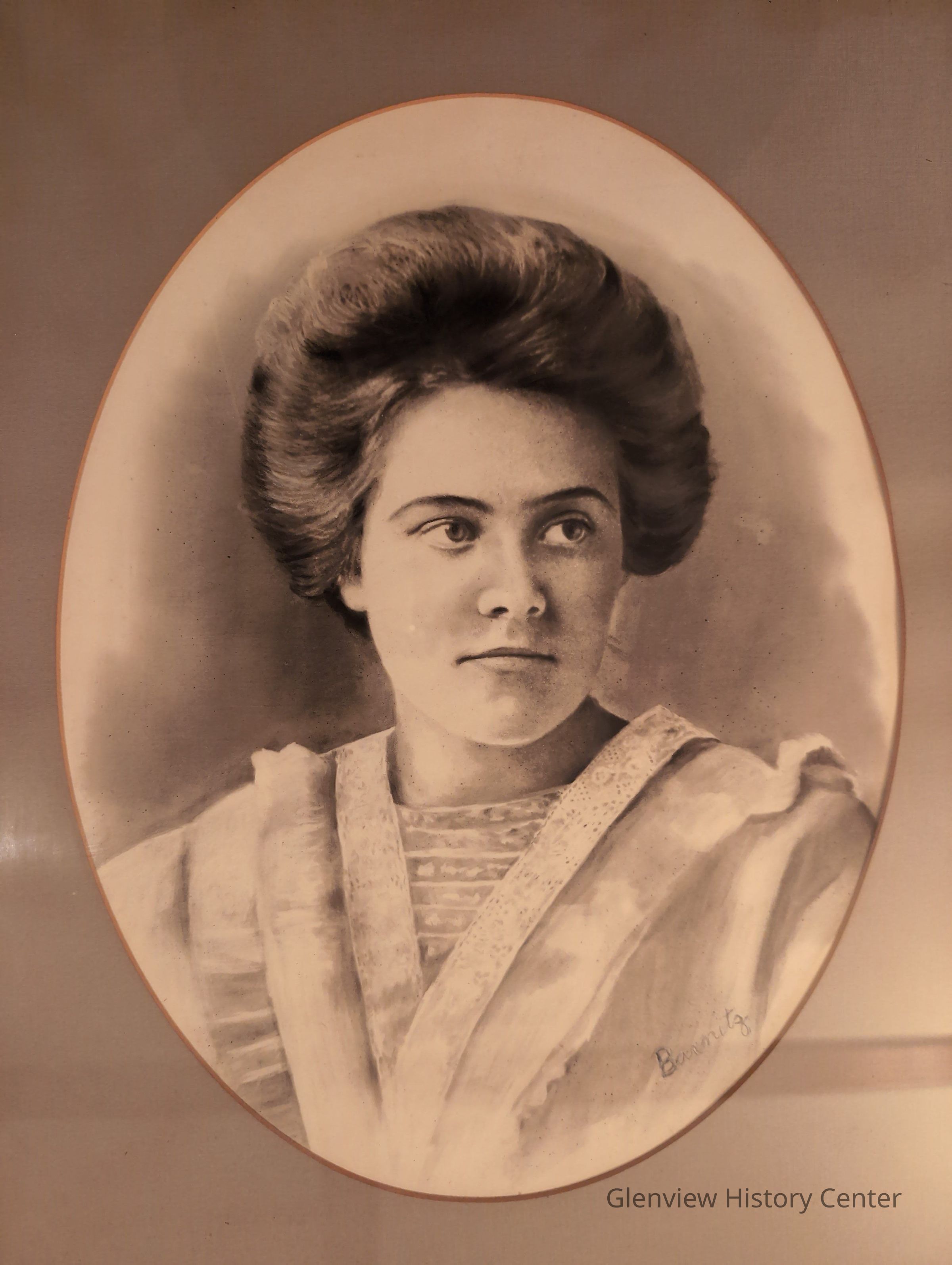A hand-tinted oval photograph of Katherine Haupt Rugen (1890-1920) in a black jet wood frame.Context