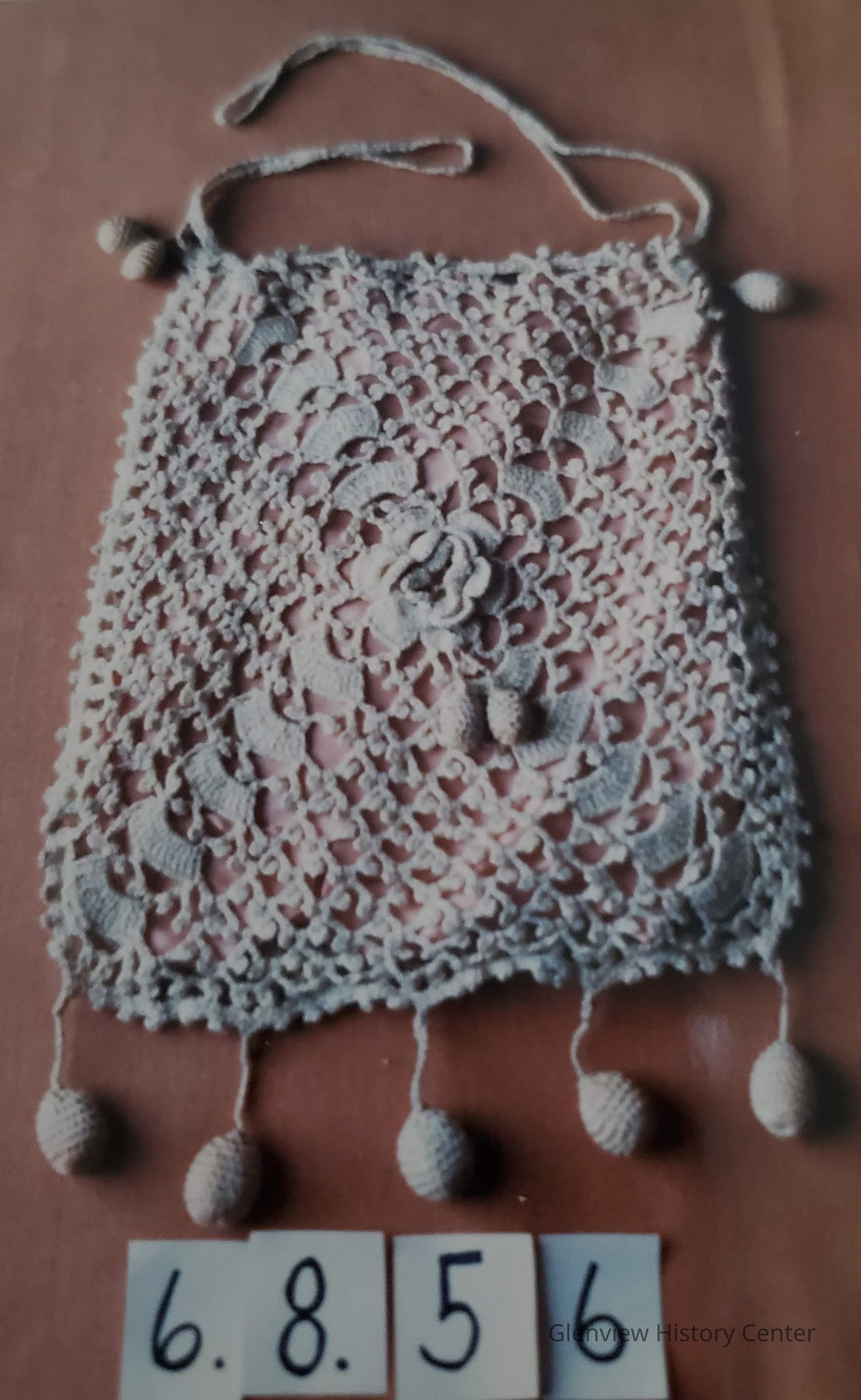 All-over crocheted - beige cotton yarn - peach faille lining. Crocheted drawstring in same ecru yarn. Crocheted (5) balls decorating base of bag. Crocheted rose and 1 ball in the middle of each side of purse.