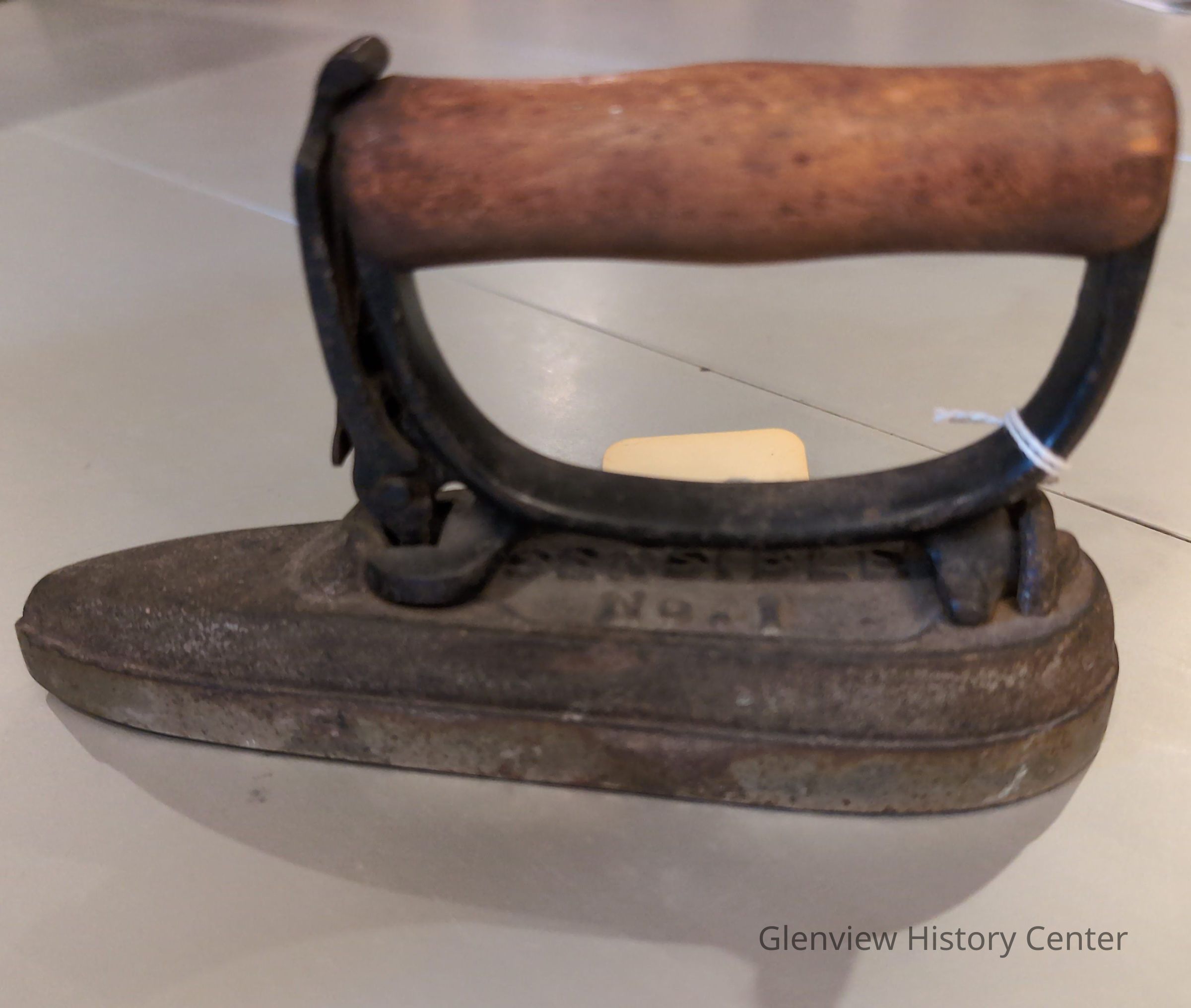 Small narrow iron for pressing sleeves with detachable wooden handle.
