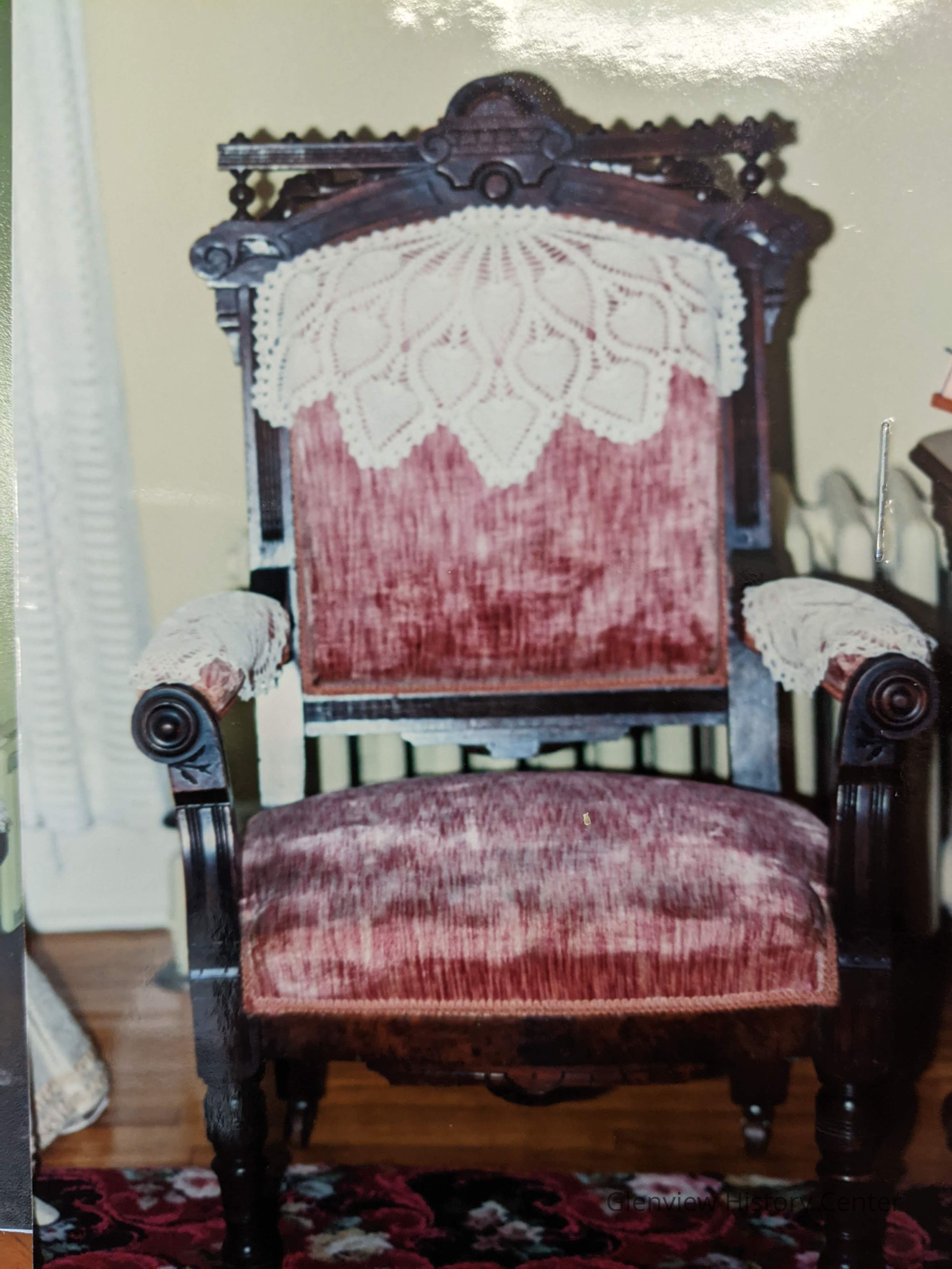 Armchair with plush upholstered arms and seatback with crocheted antimacassars.Context