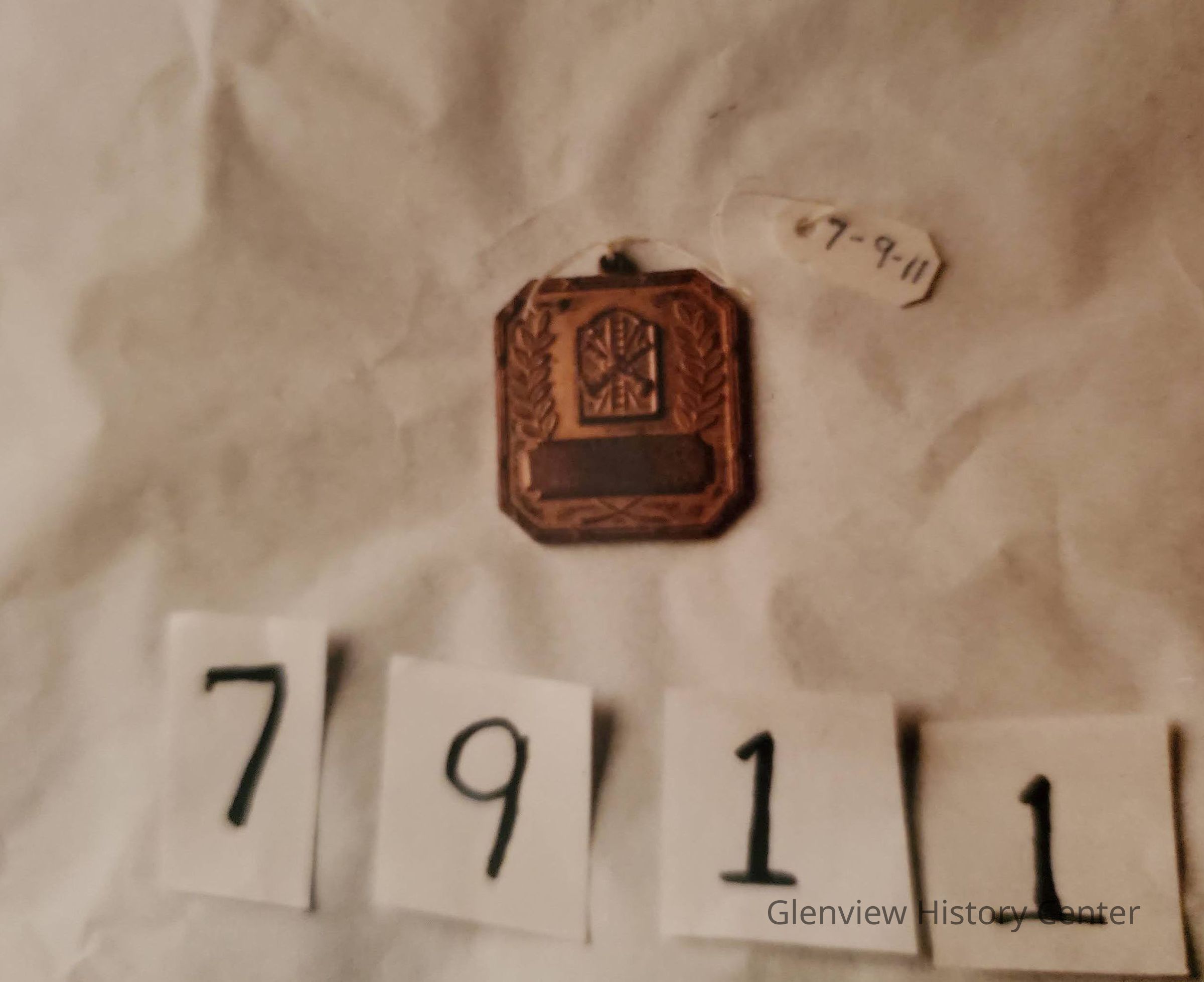 Squared gold metal trophy for 1st. place Illinois State Water Fight, Rockford, IL October 14, 15, 16, 1948. Firemen's symbols.