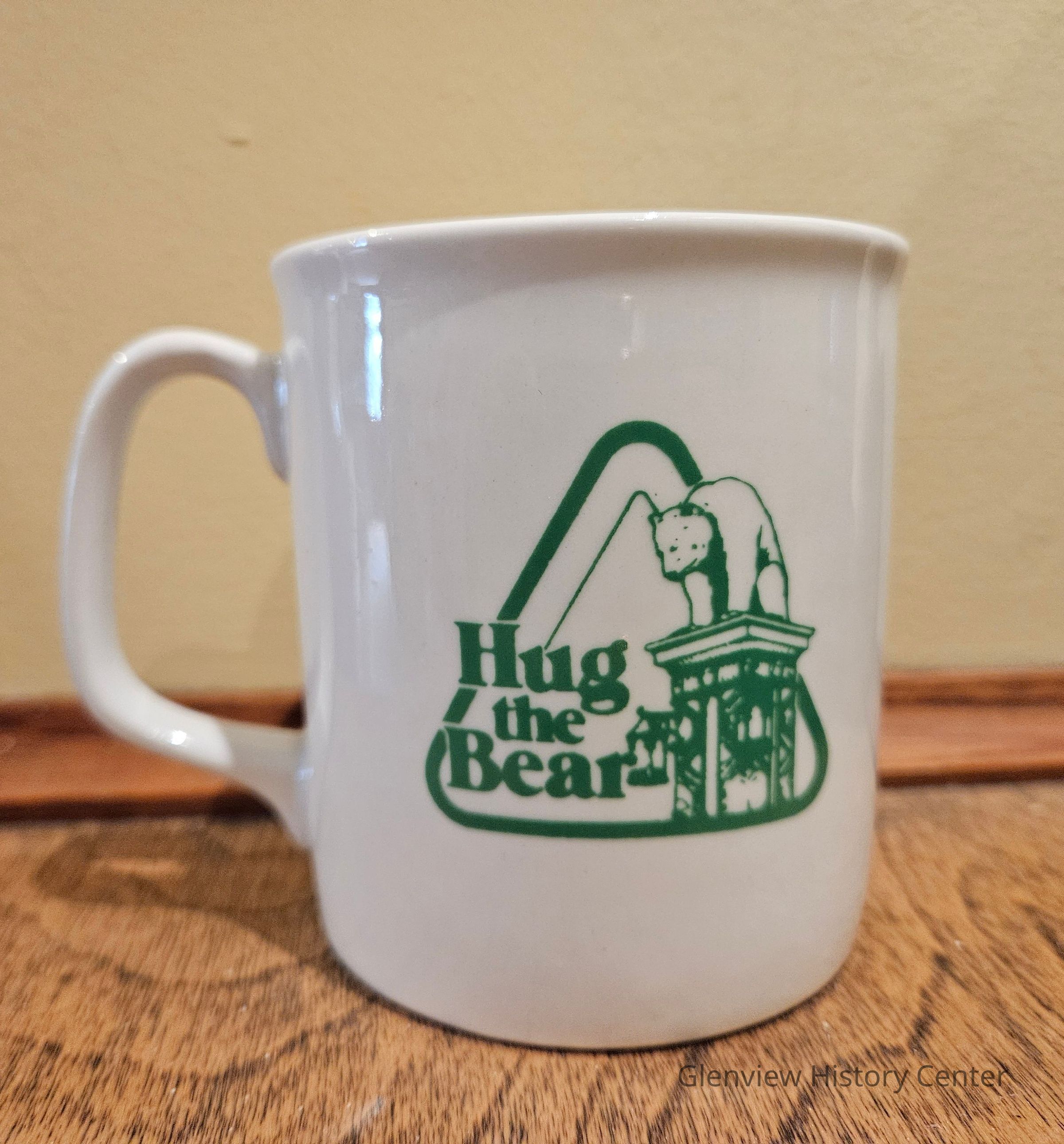 White ceramic mug with green image of the Jackman Bear statue within a triangle and the phrase "Hug the Bear" On reverse: "25th Anniversary GLENVIEW Civic Awards Night March 20, 1992"