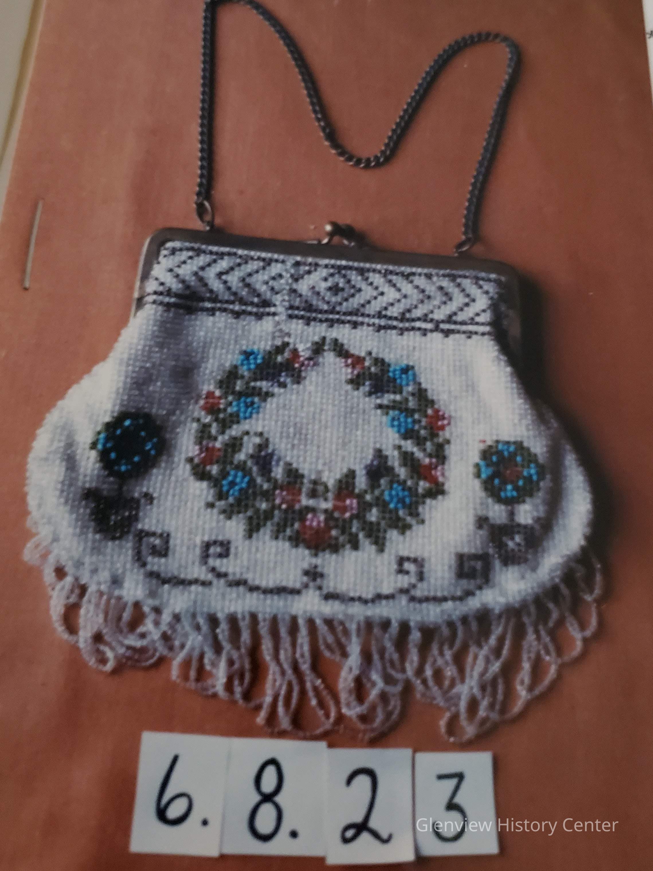 Beaded Evening Bag with Metal Top and Chain Design of Glass Beads in a Wreath PatternDescription