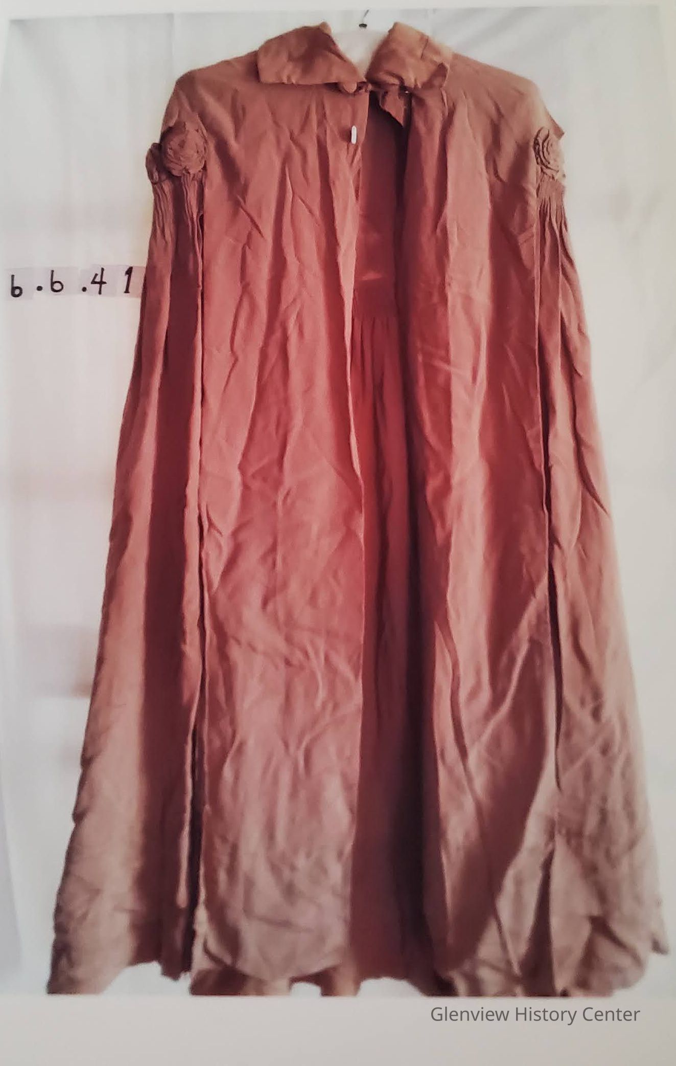 Floor length beige silk cape, button fasteners, flower designs at top of arm.