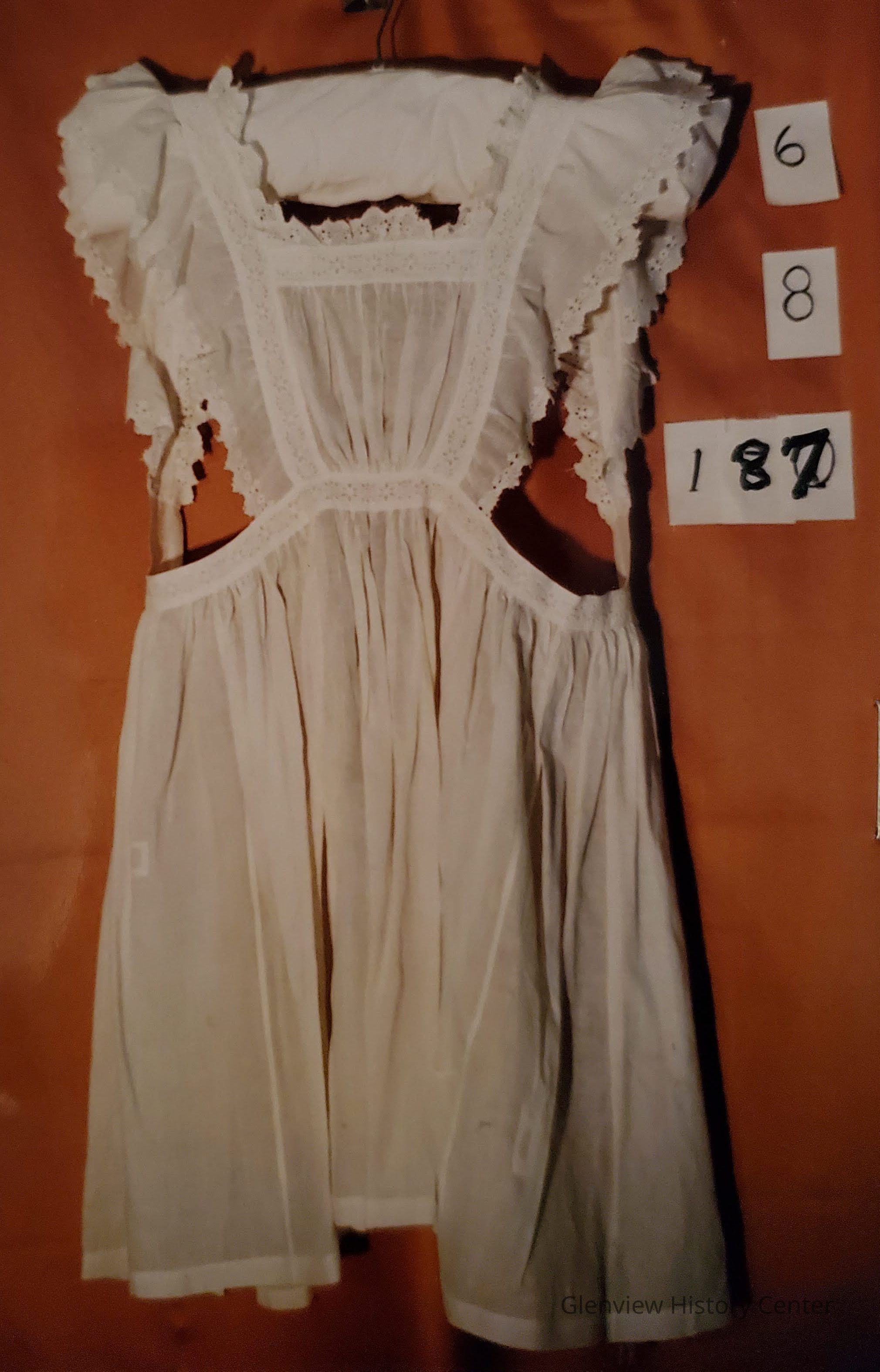 Bib apron, white, fine cotton; tie back eyelet lace trim on shoulder straps and bib edge....2 mends.