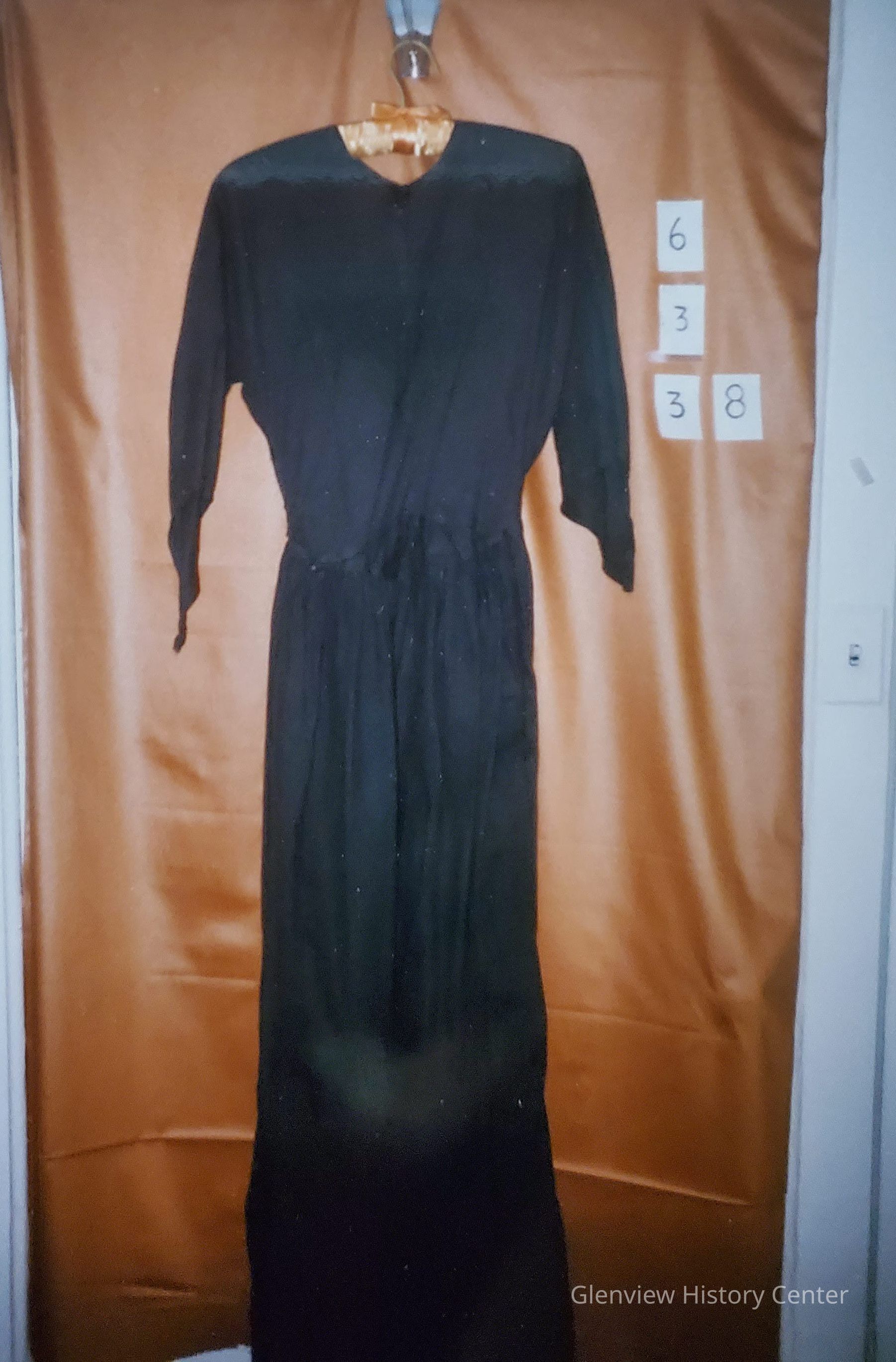 Black garden cotton dress - full length; "V" neckline with a hook and eye close at neckline; center back 6 button close - buttonholes are home-made; Raglan 3/4 length with tapered point at outer edge; Dress is machine stitched; Bodice has no shape; Dress is machine stitched; bodice is attached to multi-pleated shirt (all around pleat) lace triangles are attached to the bodice in a decorative overlay with one large one in front and two smaller triangular lace insertions on back. 14-1/4" above hemline is a felt seam that circles the skirt. Machine stitched 2-1/4" hem.