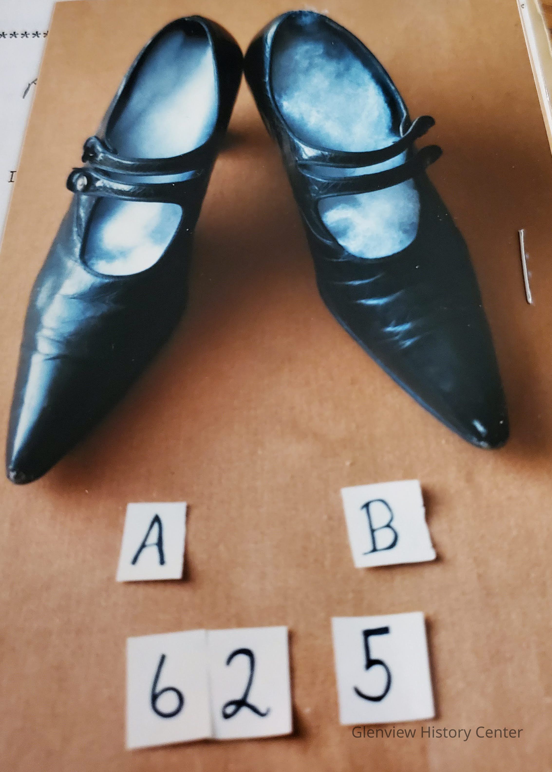 Black leather shoe with two pearlized buttons with strap; very narrow pointed toes; 2" heels.
