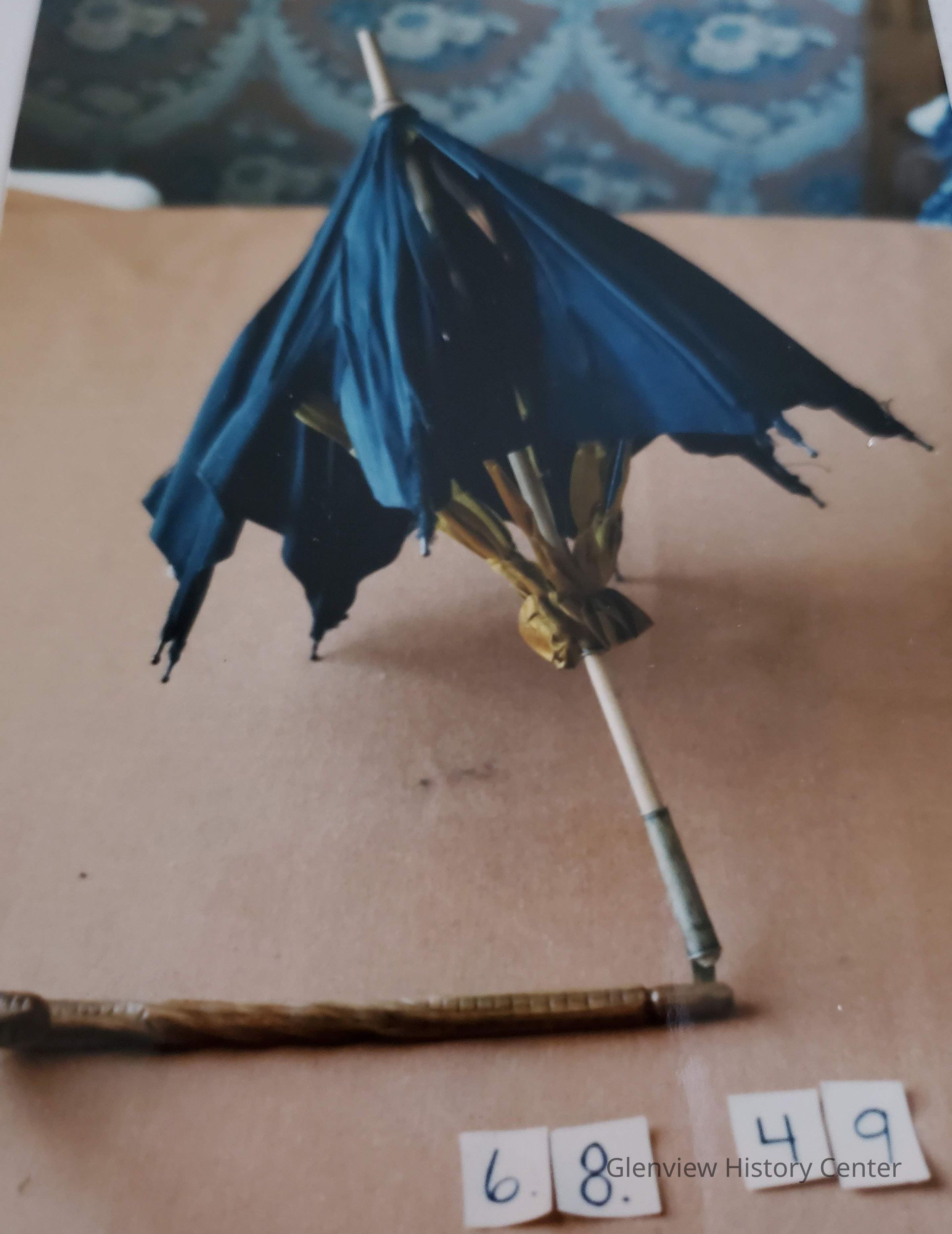 Small black ribbed silk parasol, 27" long with wooden folding handle; (in two sections) - "J" shaped end. Yellow gold satin ribbon covers under wire - parasol center to end of rib is 10.5"