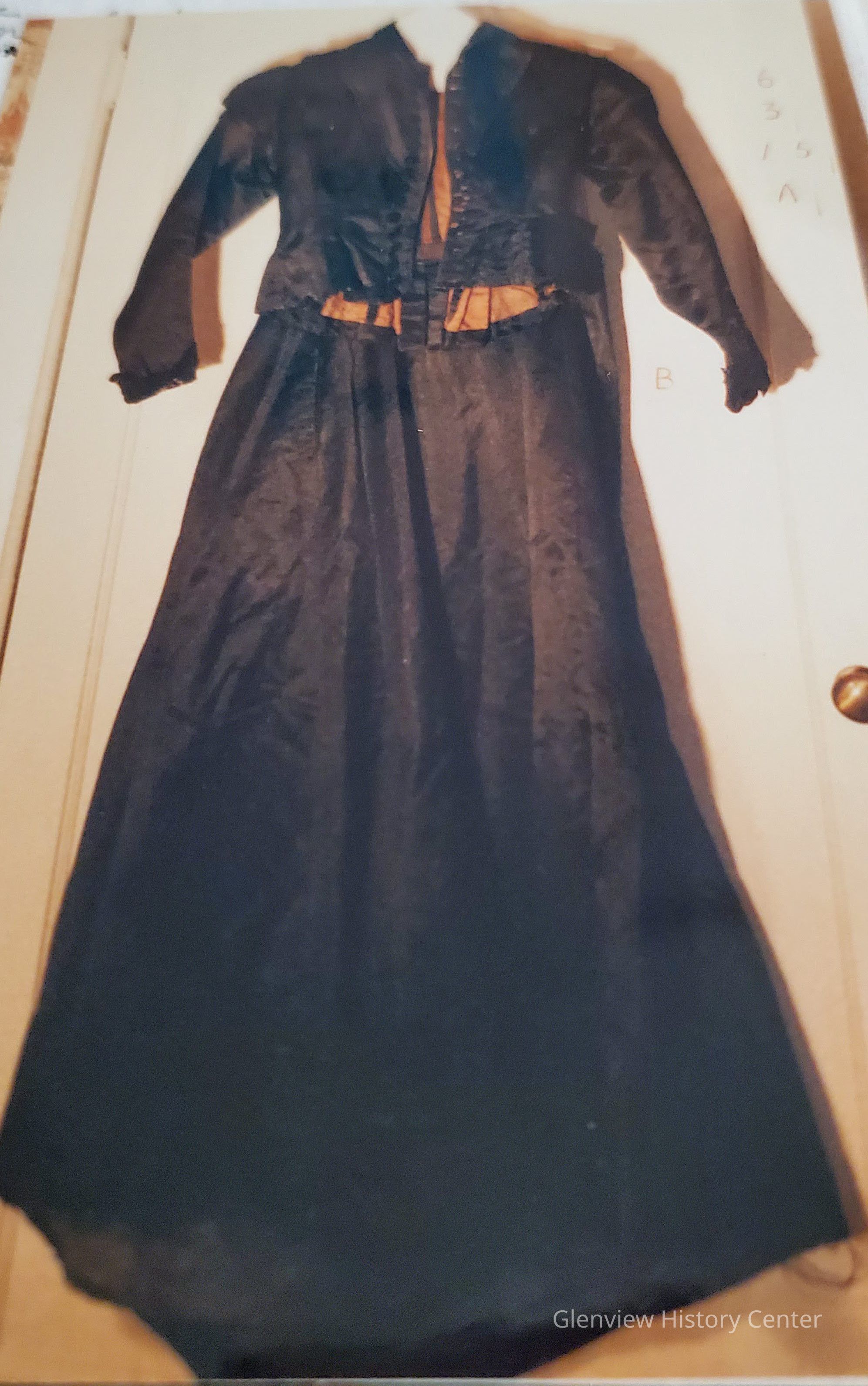 B) Black silk taffeta fitted jacket. Center front opening 16-1/4" from collar seam to bottom edge, 16 machine button holes and buttons 1" apart. Buttons 5/8" in diameter. Decorative top like snowflake pattern, in good condition. 1-3/4" Peter Pan collar and an under collar 5/8" deep. Length of collar 15-1/2". Fitted jacket with dart seams - first seam is 3-3/4" from center front and following one is 5-1/2" from center front at bodice. There is a 5" stay. One row of machine stitching of light brown 1-1/4" from center edge and on center edge is machine stitching less than 1/8 of 1" - self fabric bias strip is 3/8 of 1" wide begins a center vee at the eighth button hole, continues over shoulder at 2-1/4" from shoulder line, continues into back which makes a vee 5" down center back. There is an applied cotton lace 3-1/8" in width attached to bias strip. A NOTE: looks like it was applied later of lesser quality. Leg-o-mutton or exaggerated puffed cap sleeves 6-1/4" from shoulder seam to edge of pleated cap. Separate type fitted sleeve attached at the bottom of the armseye. There are two seams to the sleeve on outside sleeve and an inner one -- The lower seam is 15" in length, the outer seam 19-3/8" length. Sleeves seem to curve up. Sleeve not put correctly into armseye. Attached 2-1/4" cotton lace cuff and extends beyond edge of jacket sleeve by 7/8 of an inch. Inner construction of cotton muslin two shades of brown. Left front bodice: no stitching on center front edge. Folds back 1-1/2" for button holes. From center front at 2-3/4" is first dart seam and 2nd. dart seam begins at 4-5/8" at bottom of jacket edge. the metal stay is 3-3/4" from bottom of jacket. Center back of bodice: length of bodice back is 20", width of shoulder seam from armseye to armseye is 12" -- Another metal stay is 6" from center back and is 7" long. Center back has 4 one inch pleats that are 6" in length and open pleat at center back or vent. Dart seam that begins 3" from drop shoulder line and curves down to pleated section. Side seam with metal stay of 5". 3" waist cincher attached to lining with 4 hooks and eye starting 3-1/2" from bottom edge. 1" self fabric hem handstitched overcast all seams are hand overcast.Acquisition