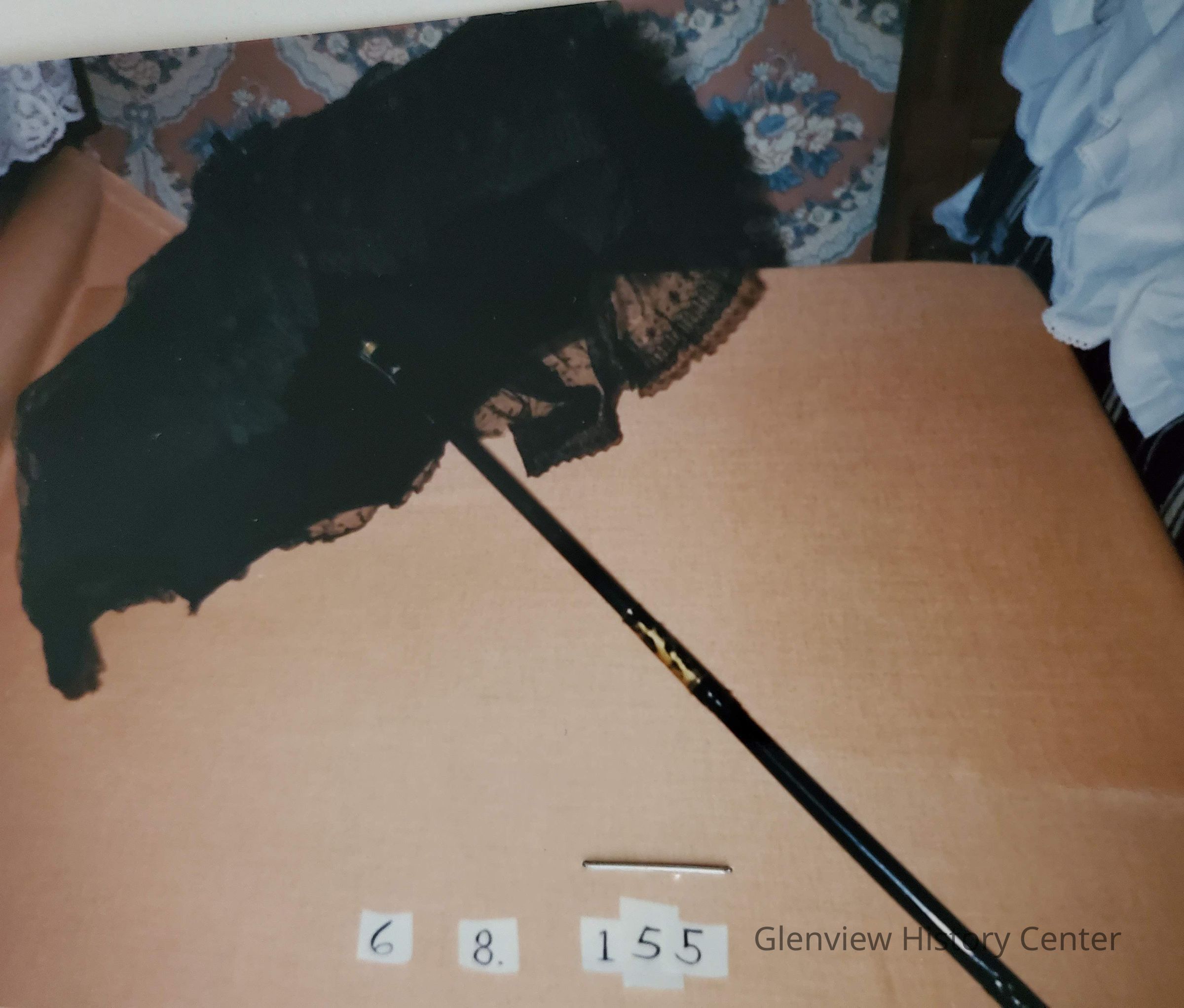 Net over satin - netting has little circle in the design. Outside edge is oval shaped with a flower. Satin ribbon at top of metal handle. Folding umbrella. Handle broken but was horse's mane. Metal shaft at junction which is 11-1/2" from bottom of curved handle and is painted black over a goldish metal. Also metal at top holding umbrella in open position. Diameter is 17".Acquisition