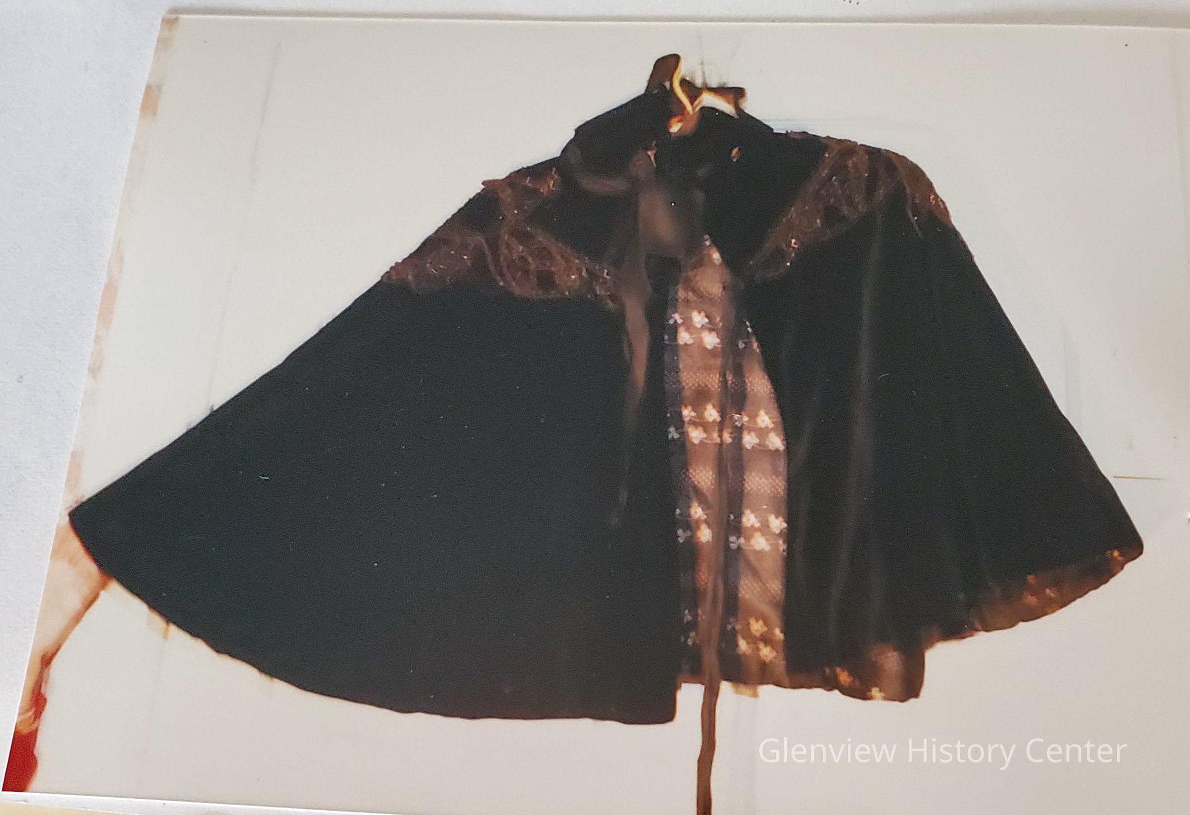Closure: collar has 3 hooks and eyes to hold collar up to neck; Cape has 2 hooks/eyes. Silk printed lining of a vining clover design.