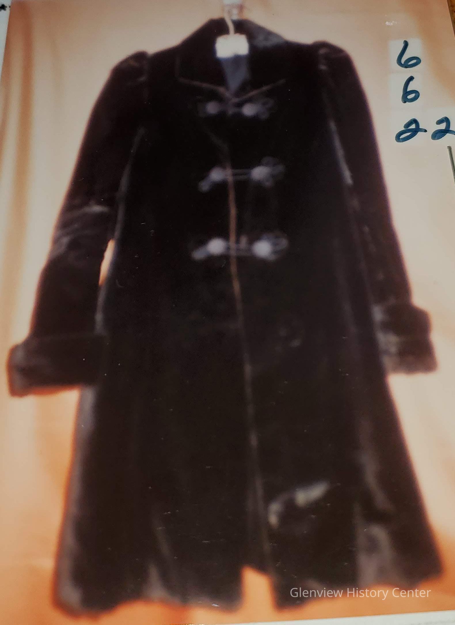 Black velvet evening coat, cuff sleeves; self collar fabric covered buttons with frog closure at neck, A-Line style; detached (see note) silk black collar large "V" shape sewn with black sequins and heads.