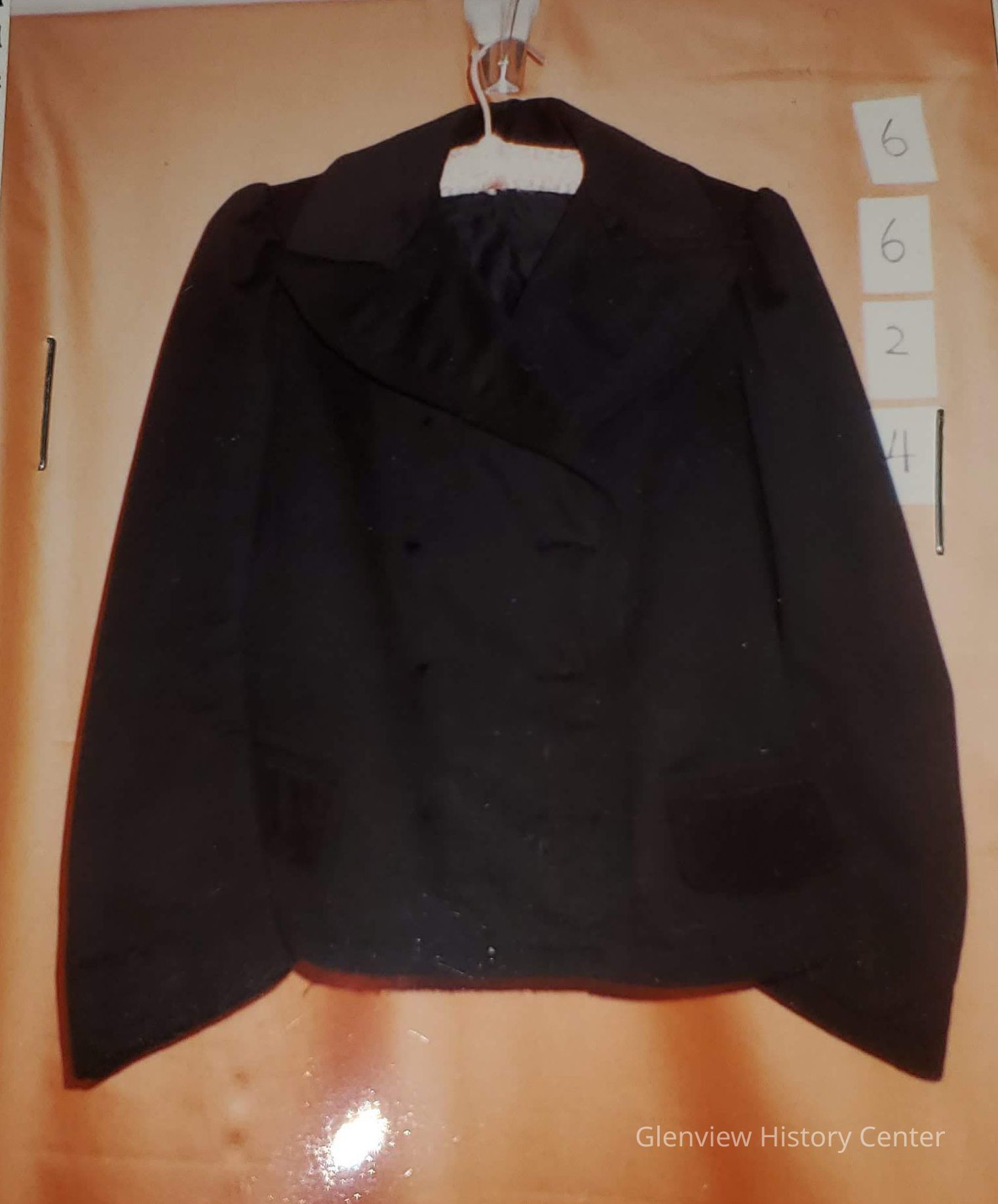 Design: 4 machine button holes; 2 flap pockets 5-3/8" wide decorative stitching (consists of 5 rows of machine stitching) located around outer edge of jacket - collar, lapel, pocket flaps, sleeves and jacket edge; 1 broken silver/gray pearl 1-3/8" button center front, left side of jacket remains at bottom; rolled collar with 3-1/4" point at bottom collar edge; lapel pointed (5-1/2" width from roll line to lapel point)