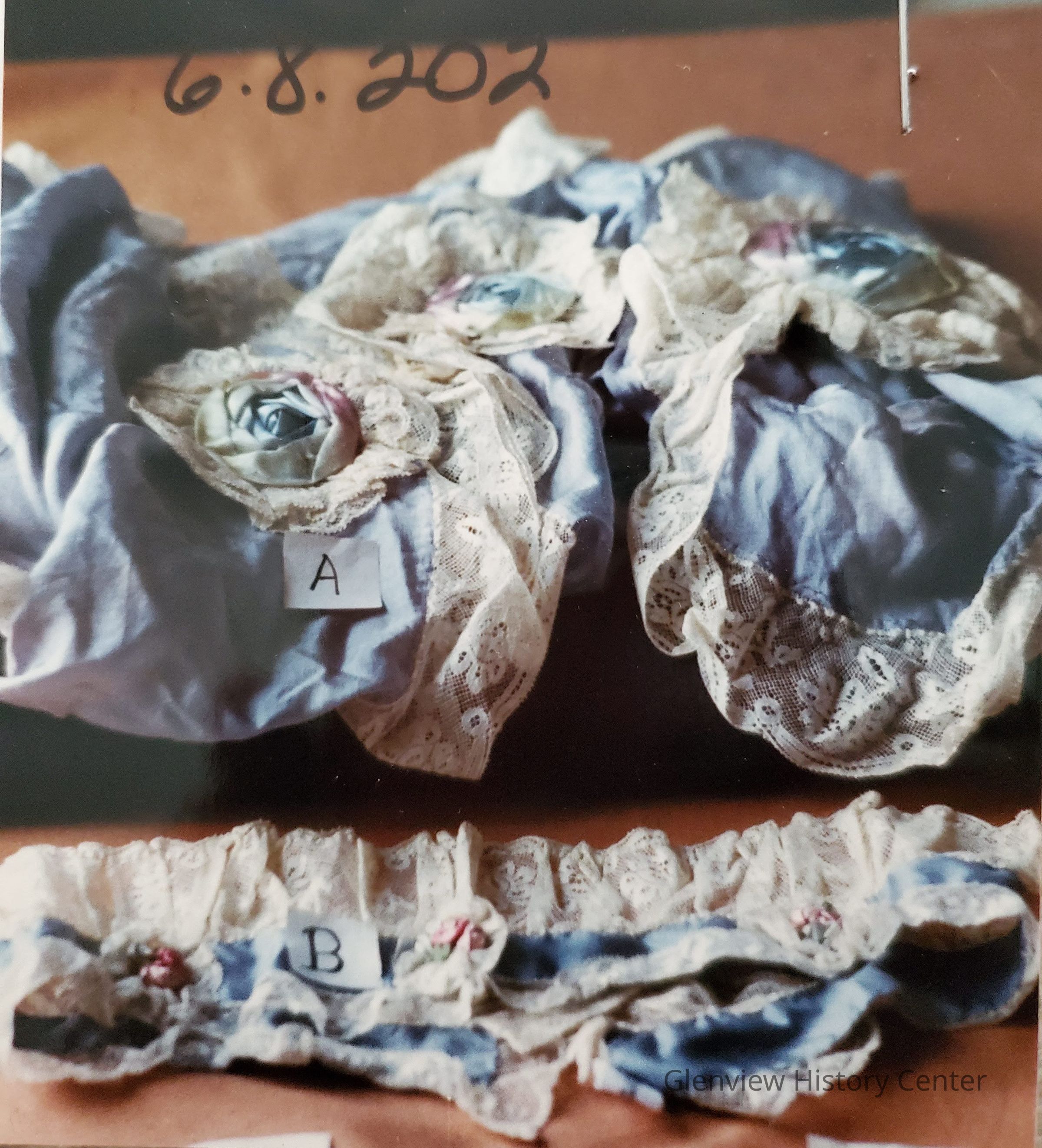 Blue bed jacket and blue headband with rosettes, 3 each. Rosette on sleeves and one on front of jacket.