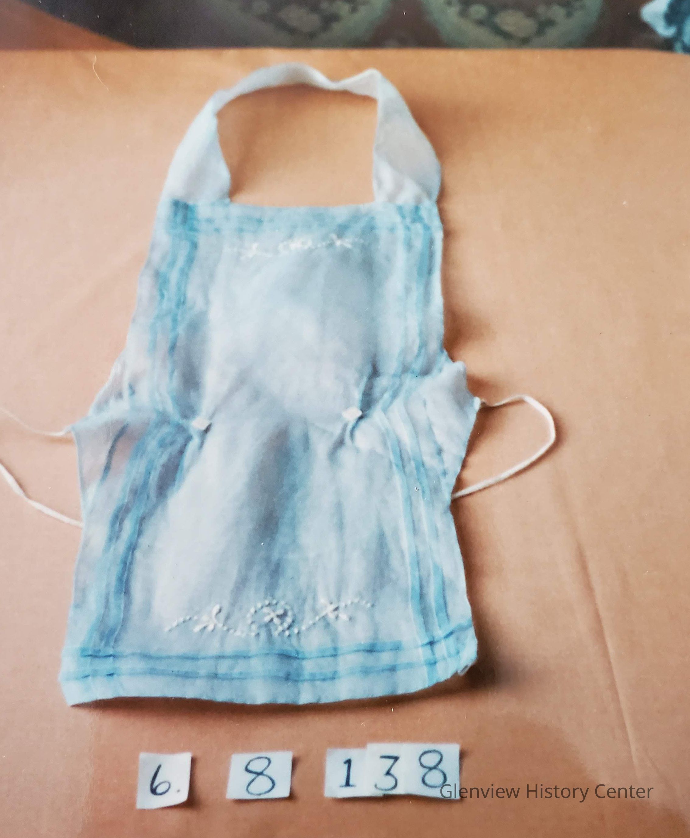 Vest Front: Blue organdy, 9-1/4" X 19-1/2". Starting 7" below top is an elongated triangle attached to front of vest. Sewn at outer point is the tie of 1/8" elastic sewn on right side and snaps on left side (1 snap). Loop top 2" self organdy is sewn on right side and 2 snap close on left. Decoration of 2 inverted pleats turned to outside 1/4" in width and 1/4" apart outline vest all four sides. Center front 2" below top edge is a hand embroidered loop of dots which extend curving upward 3/4" from loop is a 4-petal design. Same design is repeated 2" from the bottom. At waist are two 1/2" square mother-of-pearl buttons sewn to dart for shaping.
