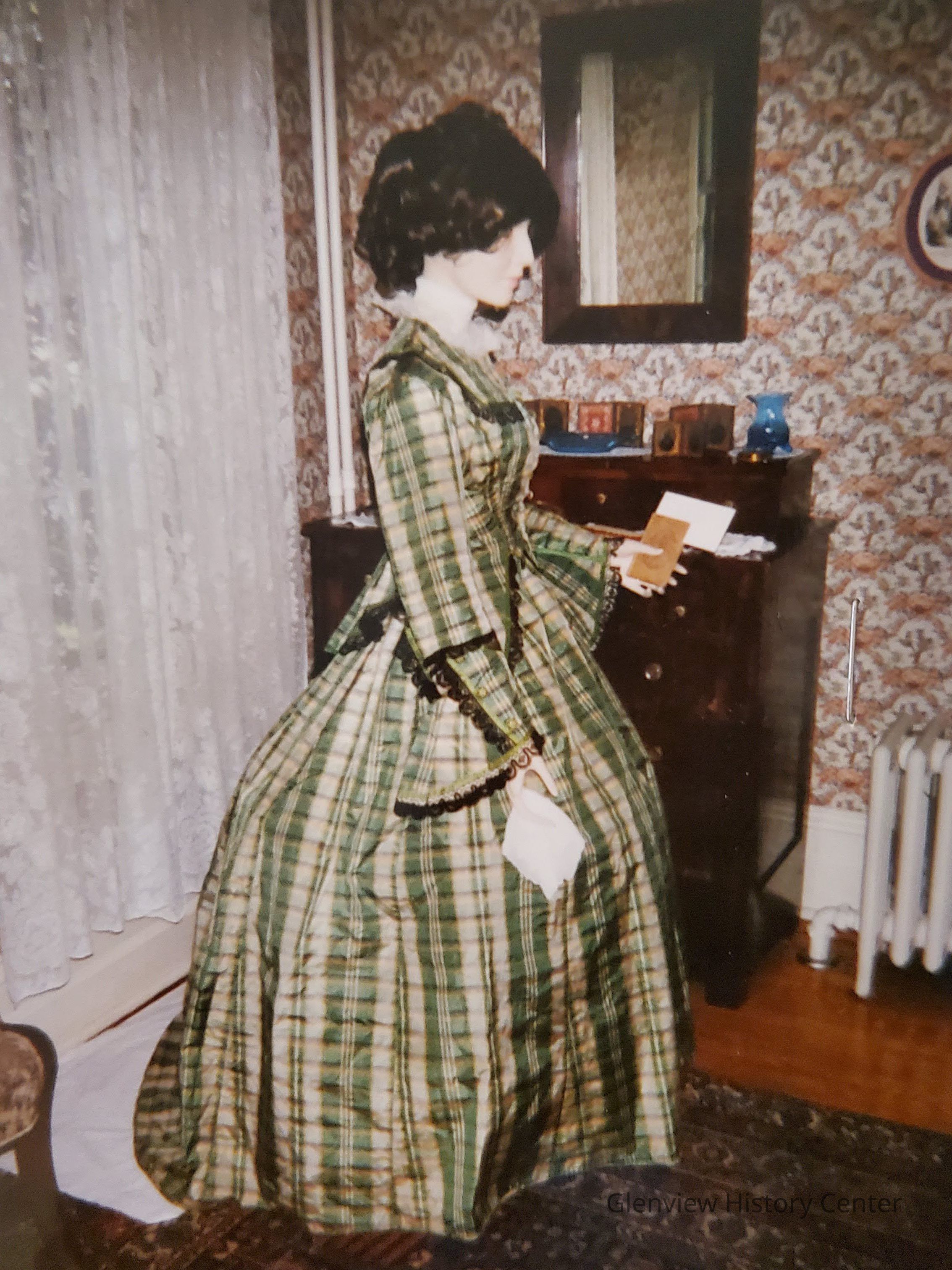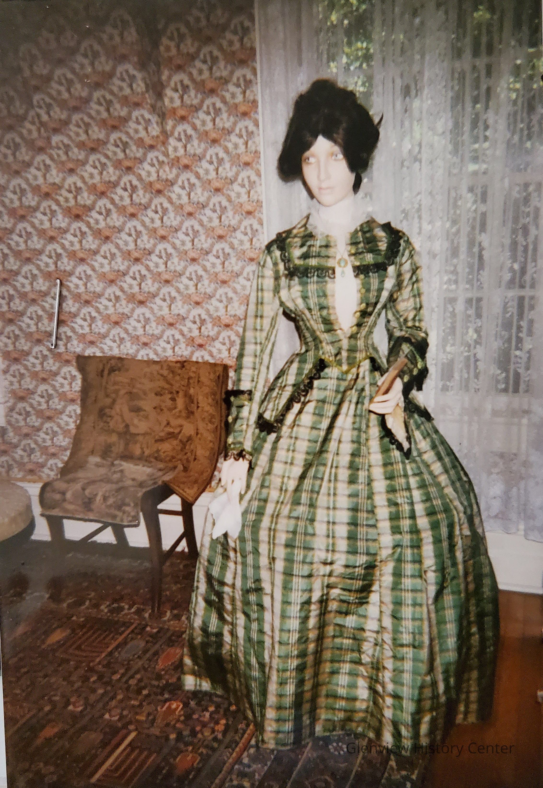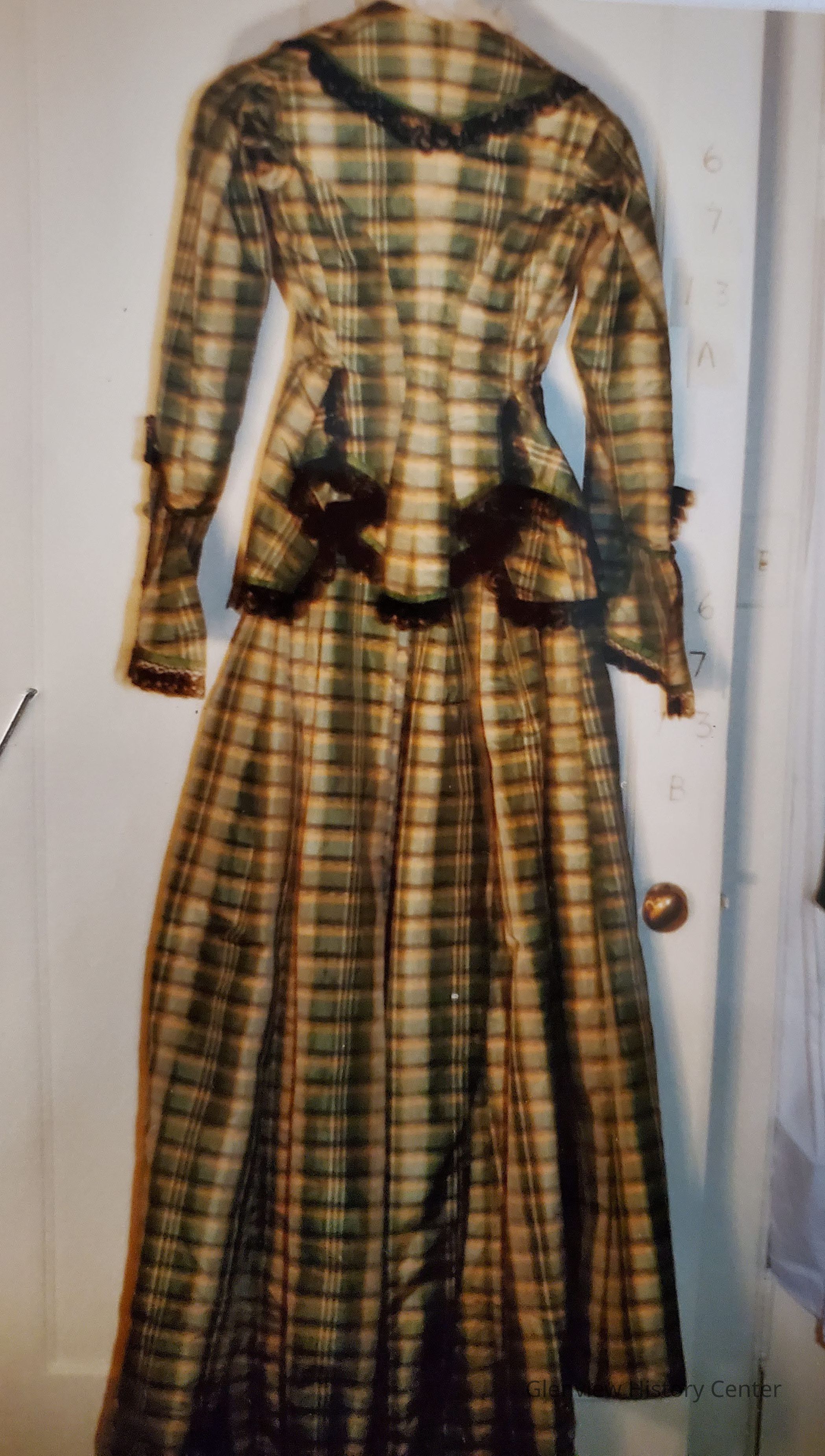A) Silk Taffeta green plaid fitted bodice. Seven homemade silk thread covered decorative buttons with an additional button pinned inside - center front length 15-1/2" long - hook and eye closing, 13 hooks and eyes front bodice 4" down from center front neckline self fabric yoke. Trim 1/4" width. Greenish yellow silk ribbon. Yoke 3-1/2"wide at shoulder line. Shoulder line seam is 5-3/4" long from neck to arms-eye. Lace is applied under silk ribbon - is homemade black lace of 1-1/4" width on bodice. The lace is very fine. There are two darts each bodice side - first one is 2-1/4" from center front and the second begins 3" from center front at waistline. Bottom of bodice hemline comes to a 'V' and it is 4-1/4" in length and 3-1/4" from center front. Replum flair separate pieces attached at approximately 2" below waistline. Peplum 9-1/2" X 4-3/4" bottom width. 8" X 3-1/2" X 6" across top. Five sided extended peplum outlined with black lace and green ribbon trim as with the bodice yoke. At the hip portion of flare which is 3-1/2" there are two homemade buttons, one at top and one at bottom. Wrist length fitted sleeve with exaggerated flare at wrist area. The sleeve is 23-3/8" long without lace. With lace it is 24-1/2". The top seam is 18". Underarm seam is 19-3/8" long. Sleeve decoration is a self fabric of two designs. One turn back of cuff trim 4" X 7" X 1" X 5-1/4". Outlined with a green ribbon and 3 homemade fabric buttons same as front also trimmed in homemade black lace on two sides (4" X 7"). Another attached self fabric to create flare 5" X 4" (4" pleated) length is 6-1/2" and width at bottom of flare will be 17-1/2". The flare is deepest at outside edge of sleeve and trimmed with black lace and green ribbon. Center back will be 23-1/4" and with lace 24-1/4". Bade yoke 3-3/4" from neckline to bottom of yoke and 5-1/4" to shoulder line and 3" on shoulder line to neck and neckline 2-3/8" - also trimmed with black lace continued from front. 12-3/4" front shoulder to shoulder. The bottom peplum comes down to a 'V' shape overlap self fabric. The center box pleat is 3-3/8 wide at lower edge. At waistline it is 2-1/2" wide. Two seam darts begin at top of box pleat and extends to middle of arms-eye 11" long. Second back dart is 2-3/4" at waistline from previous seam dart and is 7-1/2" long and ends up at underarm and is curved. It begins where decorative button and peplum are attached. Dart seam takes the place of side seam about 2" further back on back to a proper location on side seam. 14-1/2" length from attached peplum to center back seam and repeats on other side we create a center box pleat and one large pleat of 2-3/4" width to create flare and pointed back over bustle. Lace (black) and green ribbon trim continue to outline the bottom of bodice top. Complete bodice is hand-stitched.