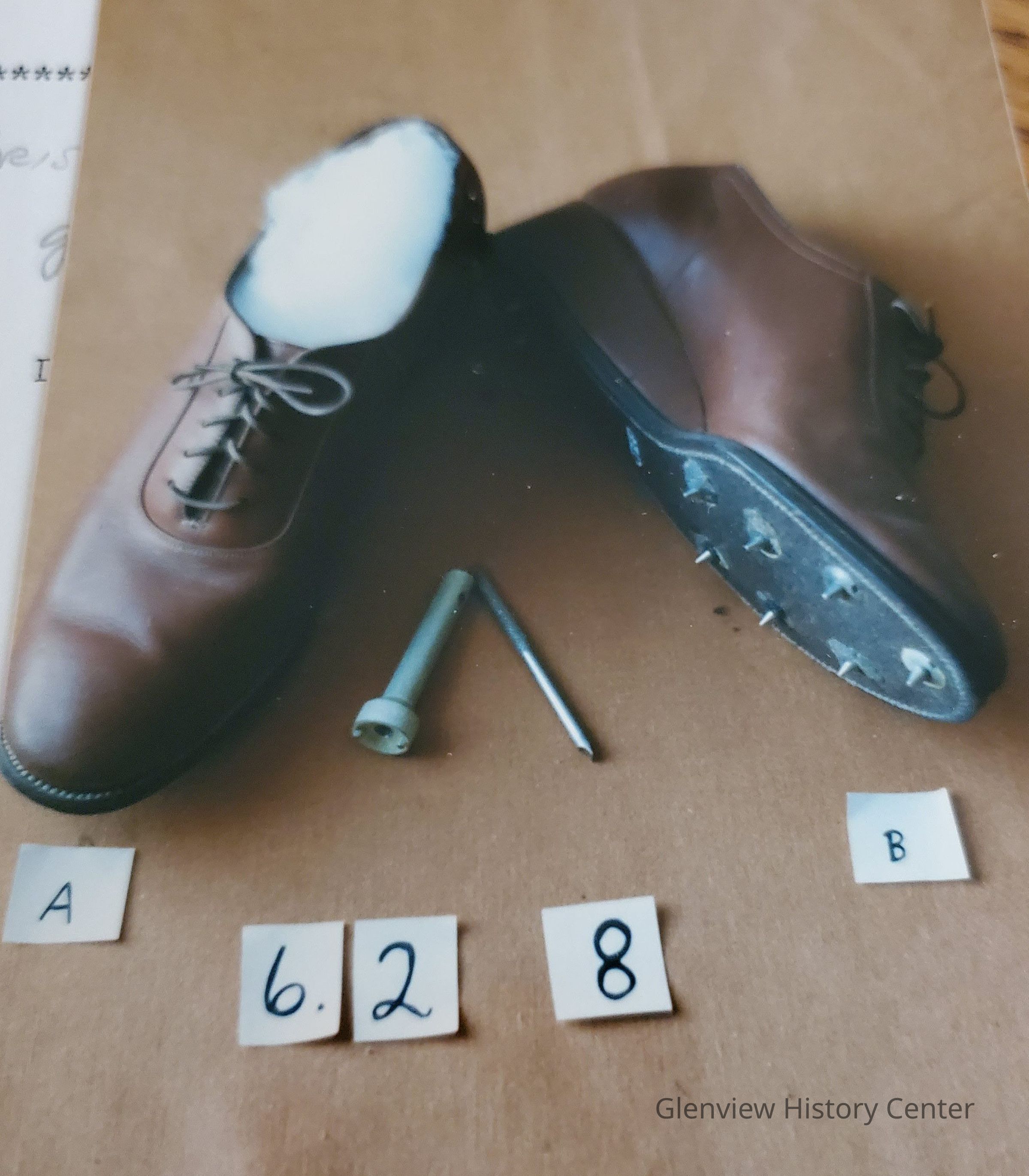 Shoes, lady's for golf, having spikes on sole. Brown leather with wedge heel - laced thru pair of 5 eyelets.General Notes