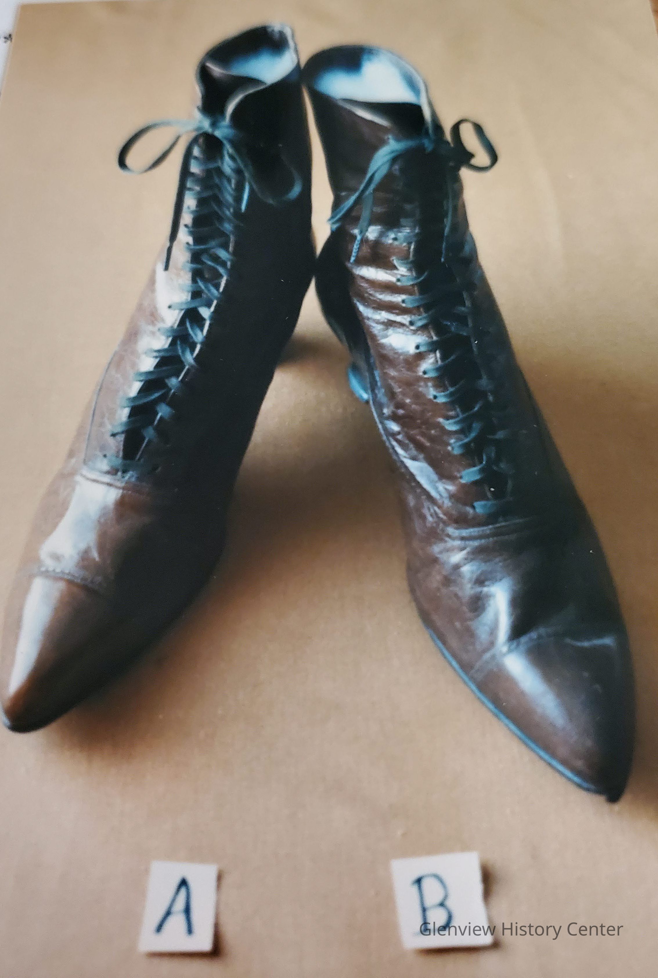 Brown leather with darker blocked 1" heels; mannish appearance; high top laced.
