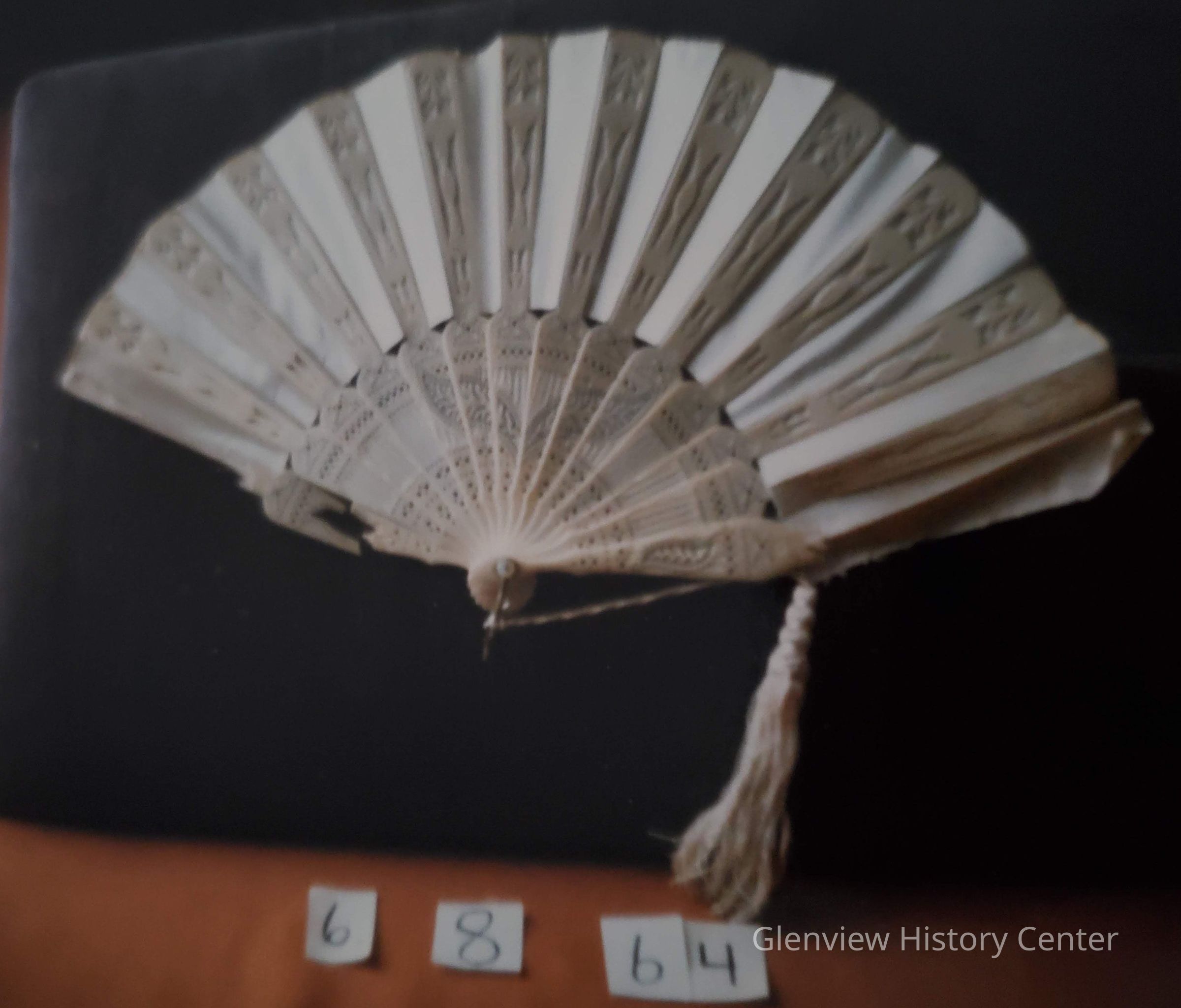 Fan, cream silk (originally white); bone ribs (3 are broken) Tassel