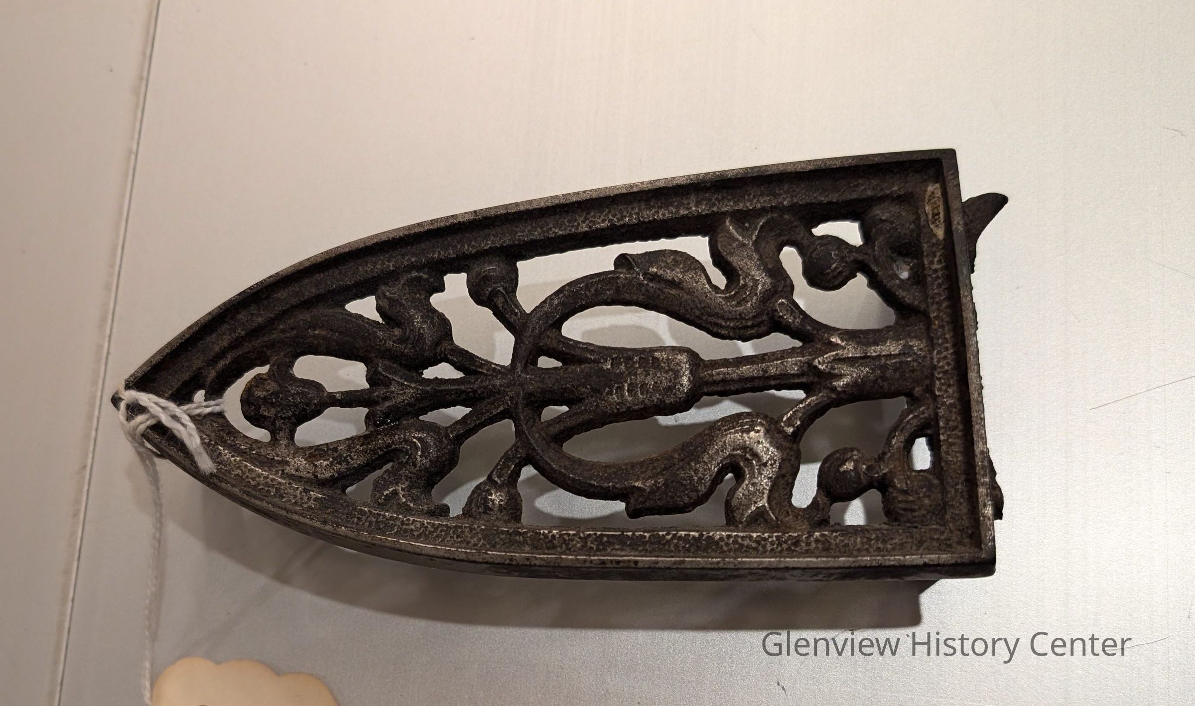 Trivet rest for pressing iron. The rest is a one-piece cast iron piece including three posts. The base is comprised of a filigree design of flower and leaves.
