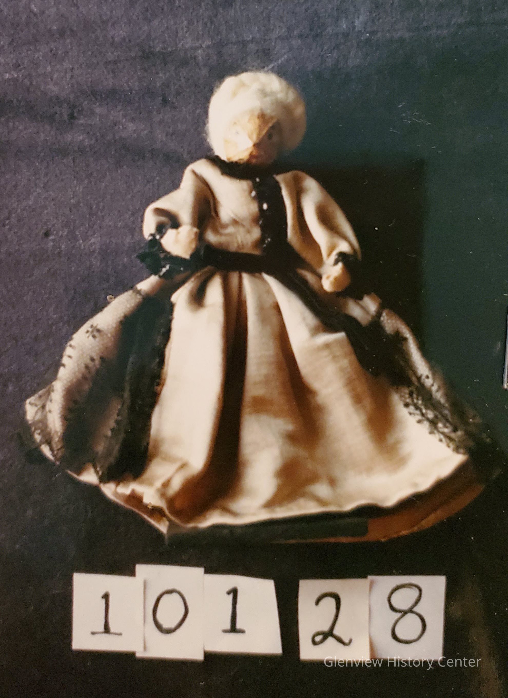 Traditional Colonial Doll: Martha Washington hair style, white; Dressed: beige formal dress with black lace trim; Hickory-nut head - hand painted.