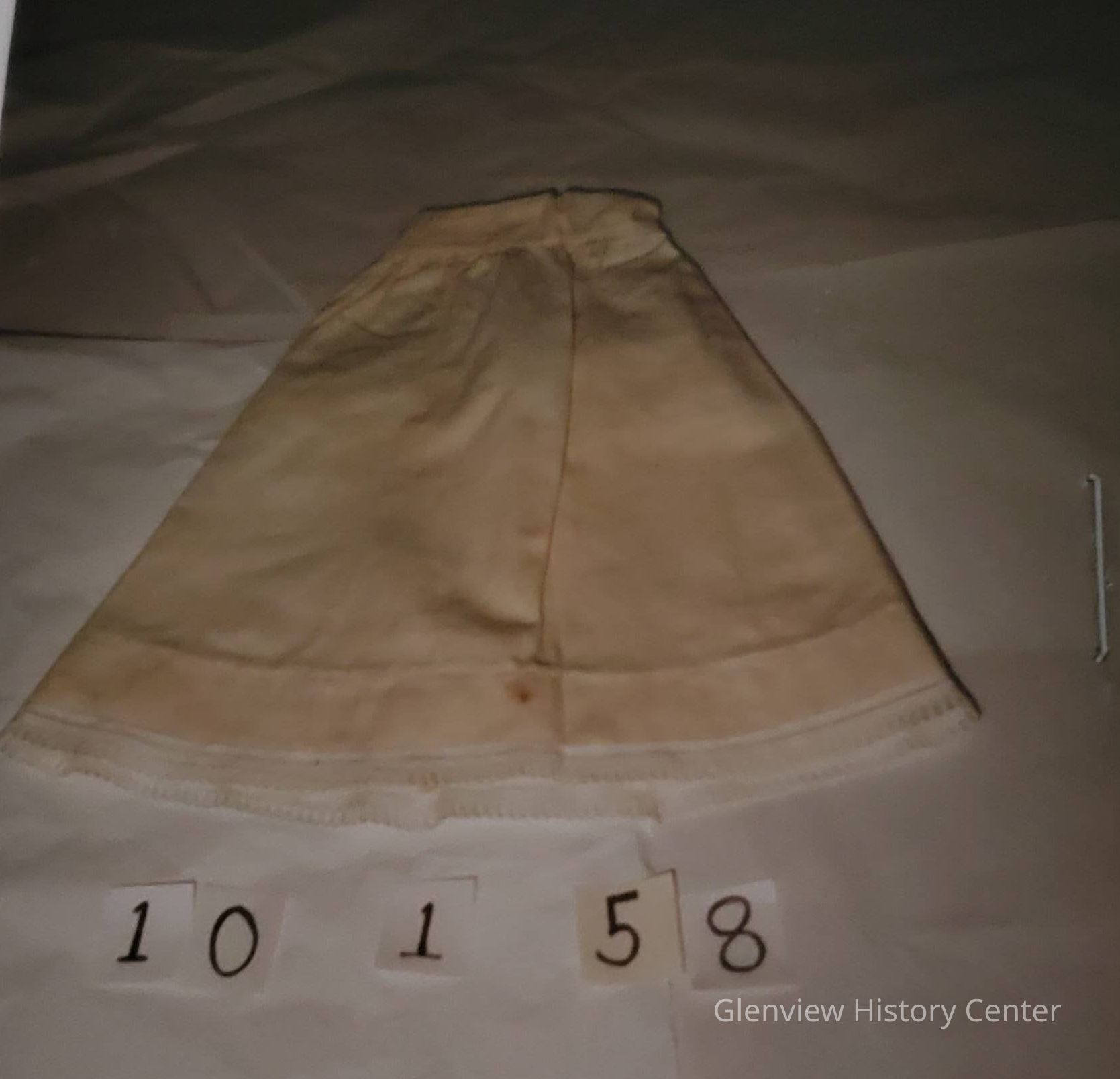 Doll cotton petticoat; gore skirt with lace trimmed hem 3/4" waistband; closure (no hook and eye) placket back opening - machine stitching 1-1/4" above hem; skirt length: 11-1/4"
